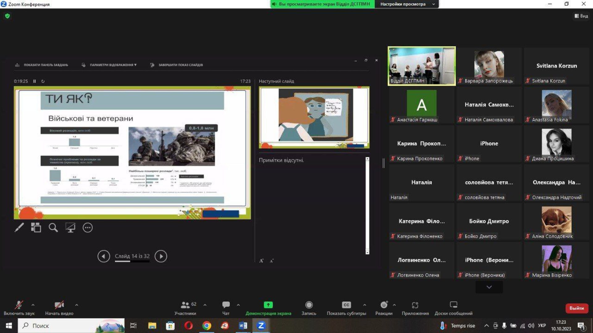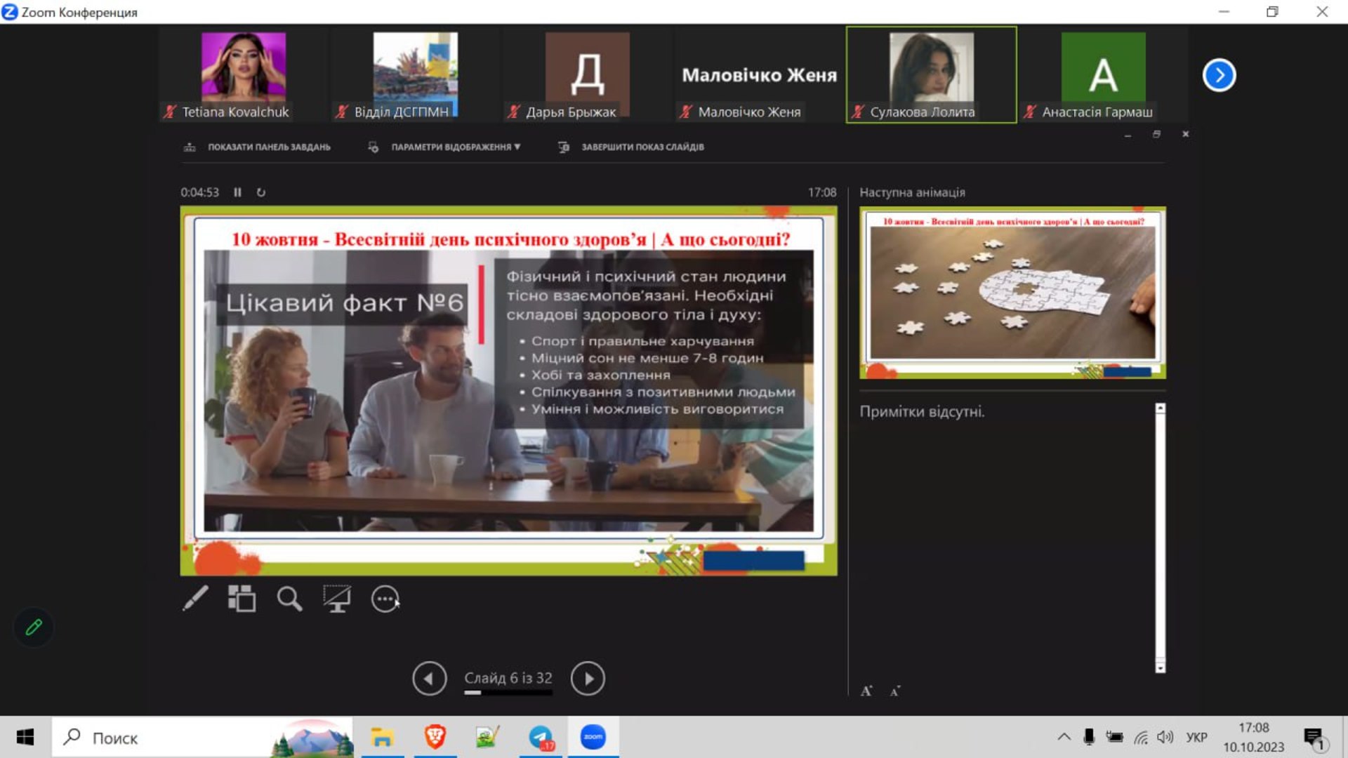 Так, першокурсники спеціальності 053 «Психологія» (групи СН-113, СН-123) разом зі своїм куратором Анастасією Гармаш відвідали онлайн-захід «Психічне здоров'я доступне всім», проведений Запорізькою обласною універсальною науковою бібліотекою спільно з Комунальним некомерційним підприємством «Обласний клінічний заклад з надання психіатричної допомоги» Запорізької обласної ради у межах Всеукраїнської програми ментального здоров'я «Ти як?» за ініціативою Олени Зеленської, у співпраці з Координаційним центром КМУ / Mental Health UA та ГО «Безбар'єрність».