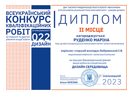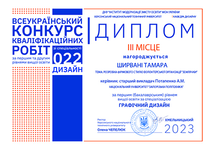 Вітаємо! На конкурсі кваліфікаційних робіт, який проходив на базі Херсонського технічного університету перемогли наші студенти. Ступінь Магістра: 2-ге місце, Ковальова Анастасія, керівник Рижова І.С. Ступінь Бакалавра: 3-є місце Ширвані Тамара, керівник Потапенко А.М. 2-ге місце Руденко Марина, керівник Бобровський І.В.
