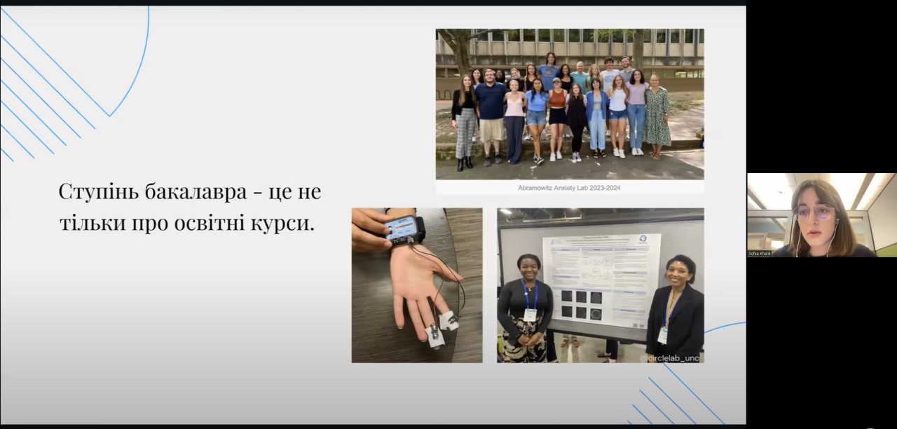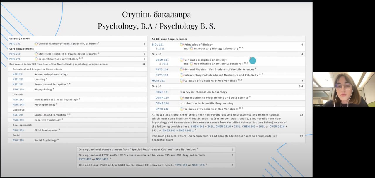 Запрошена гостя — Софія Халік — студентка 2 курсу факультету психології Університету Північної Кароліни в Чапел Хілл, США — розповіла учасникам зустрічі про себе та своє навчання в американському ЗВО; описала 4 основні кроки для того, щоб стати психологом в США; на прикладі здобуття освіти «Клінічного психолога» описала особливості навчання на бакалавраті у своєму університеті; поділилася цікавими фактами з життя та навчання американських студентів-психологів, а також власним досвідом та деякими професійними планами; відповіла на численні запитання слухачів.