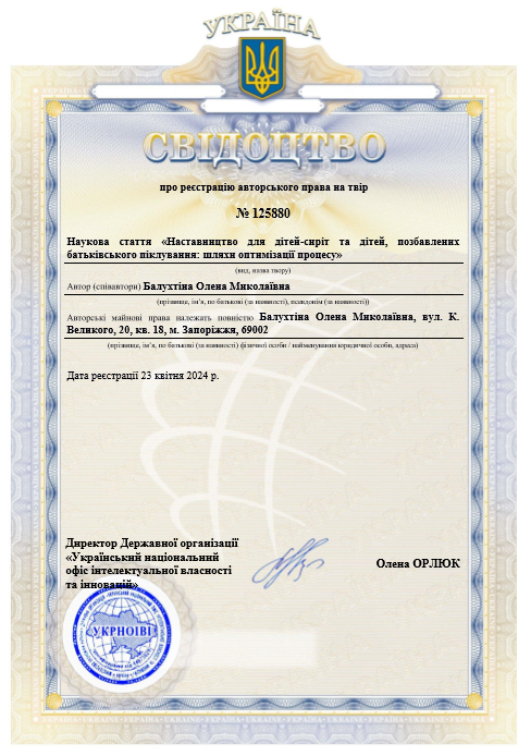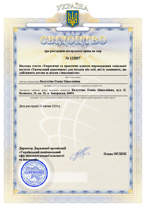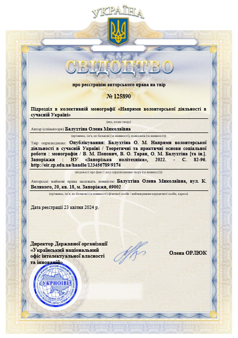 Науково-педагогічний колектив активно працює над підвищенням особистої майстерності та покращення досягнень викладачів Кафедри «Соціальна робота» згідно п.38 Ліцензійних умов. Так показник 2: наявність не менше п'яти свідоцтв про реєстрацію авторського права на твір, виконала доцент Олена БАЛУХТІНА.