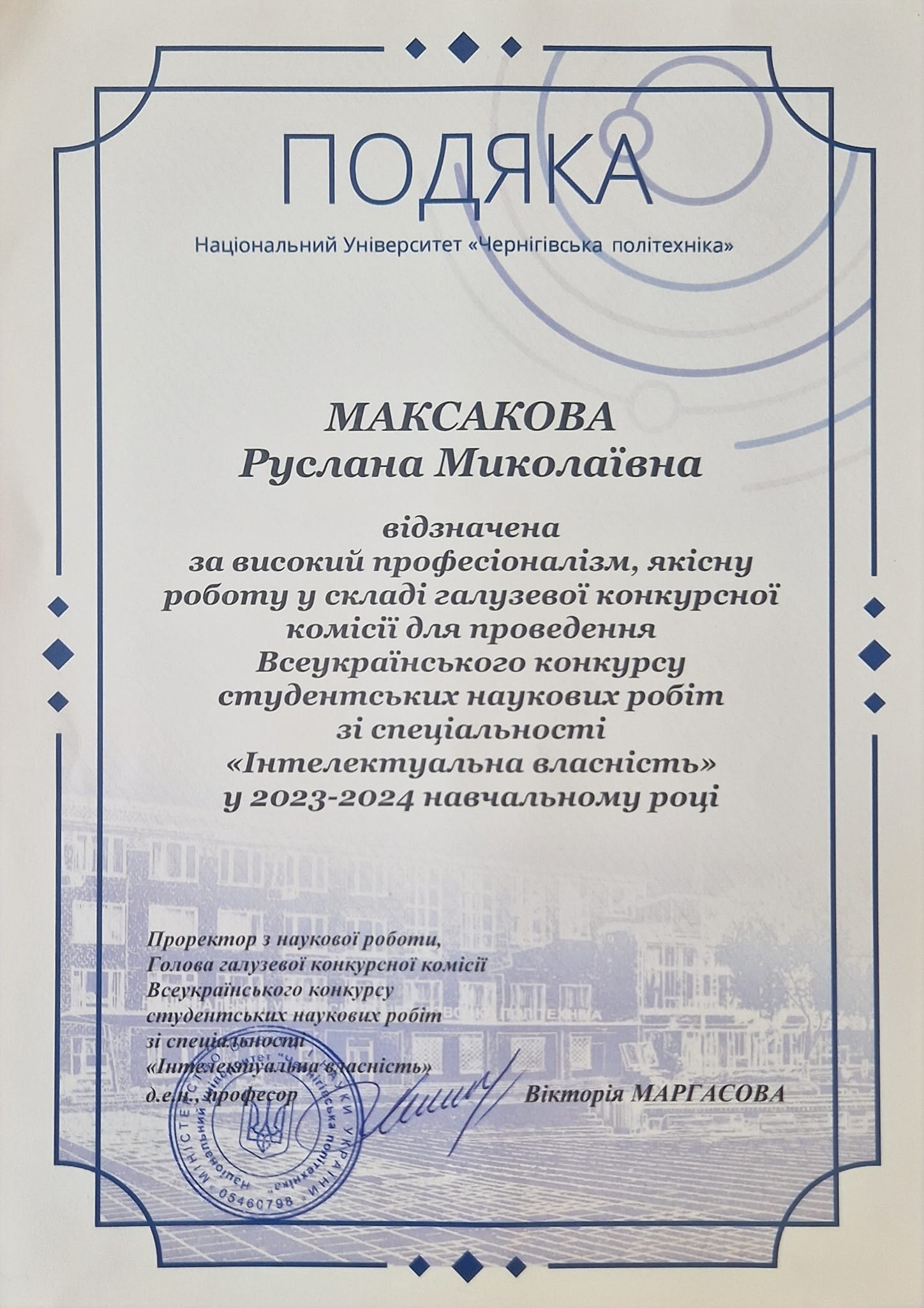 За високий професіоналізм, якісну роботу у складі галузевої конкурсної комісії для проведення Всеукраїнського конкурсу студентських наукових робіт зі спеціальності "Інтелектуальна власність" у 2023-2024 навчальному році - нашій шановній колезі, доктору наук, професору, професору кафедри конституційного, адміністративного та трудового права Максаковій Руслані Миколаївні було оголошено Подяку від Національного Університету "Чернігівська політехніка".