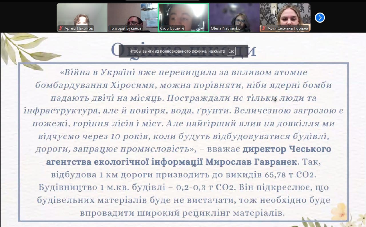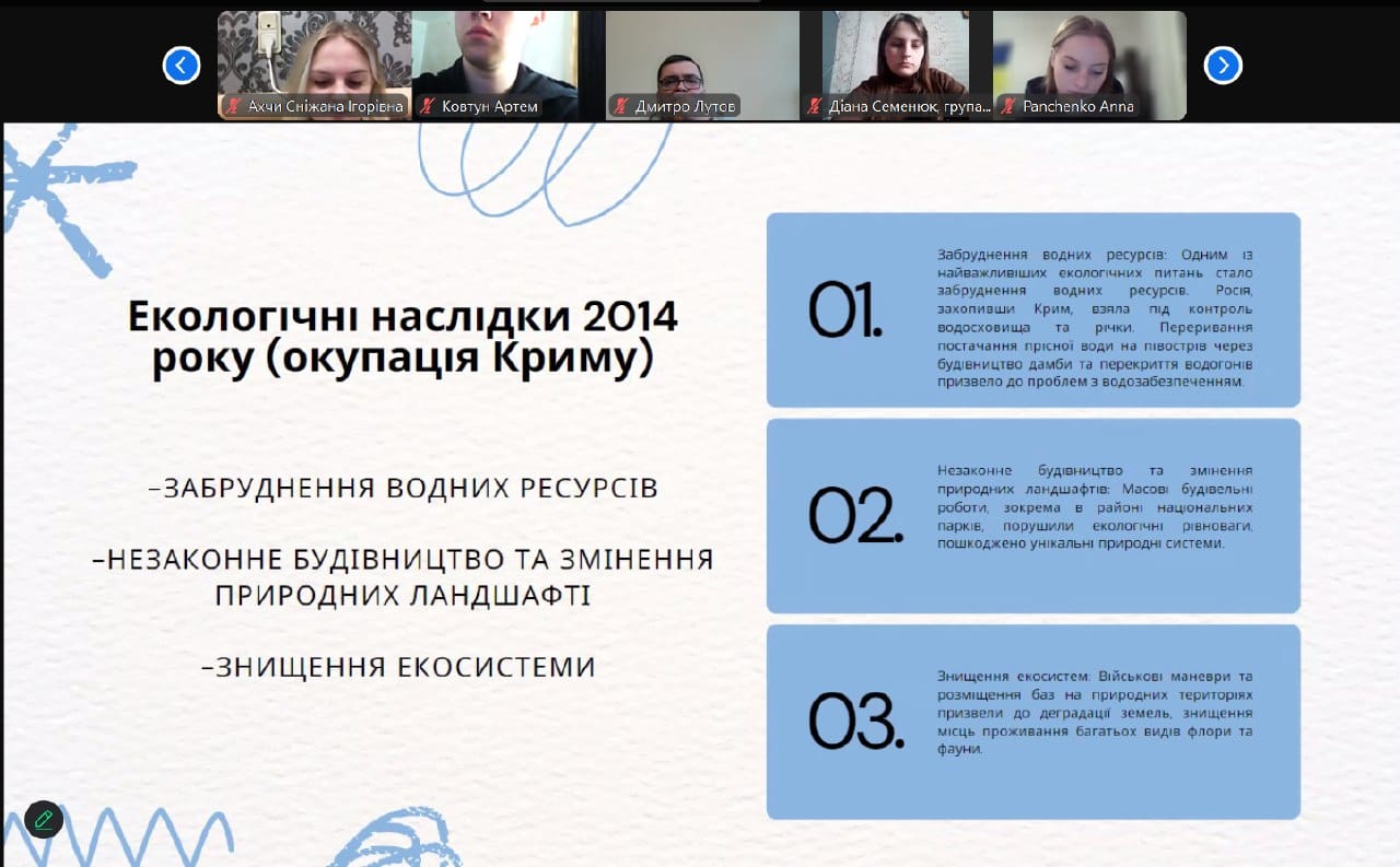В лютому 2022 року світ зіткнувся з однією з найбільших екологічних катастроф внаслідок війни, яка триває в Україні. Ця війна має руйнівний вплив на навколишнє середовище та здоров'я українського народу. Саме ця тема та проблеми пов'язані з нею стали предметом обговорення студентської молоді на засіданні круглого столу «Екологічне право в умовах війни : захист довкілля та правові виклики».