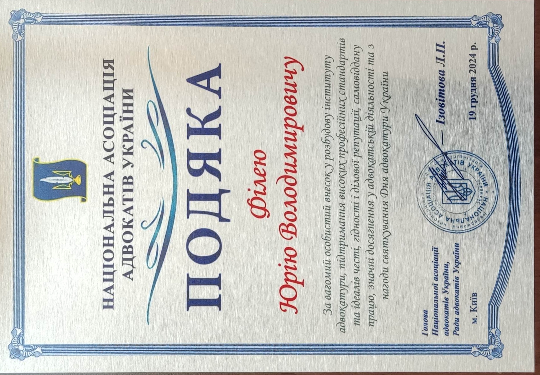 3 березня 2025 року в кабінеті-музеї історії адвокатури НУ «Запорізька політехніка» за вагомий особистий внесок у розбудову інституту адвокатури та підтримання високих професійних стандартів відбулося нагородження декана юридичного факультету, професора, адвоката Юрія Філея Подякою голови Національної асоціації адвокатів України, Ради адвокатів України Лідії Ізовітової.