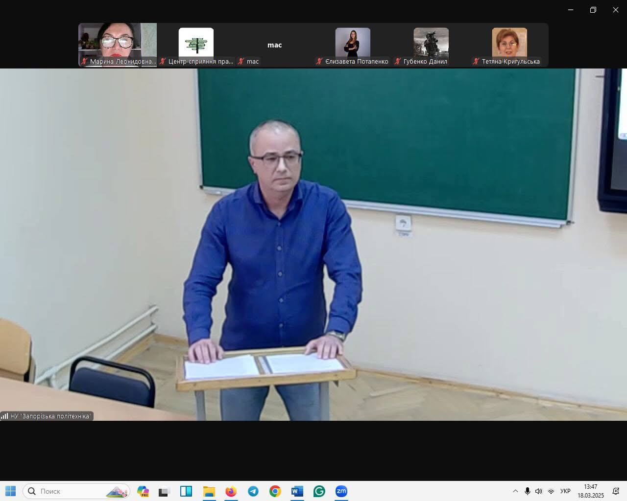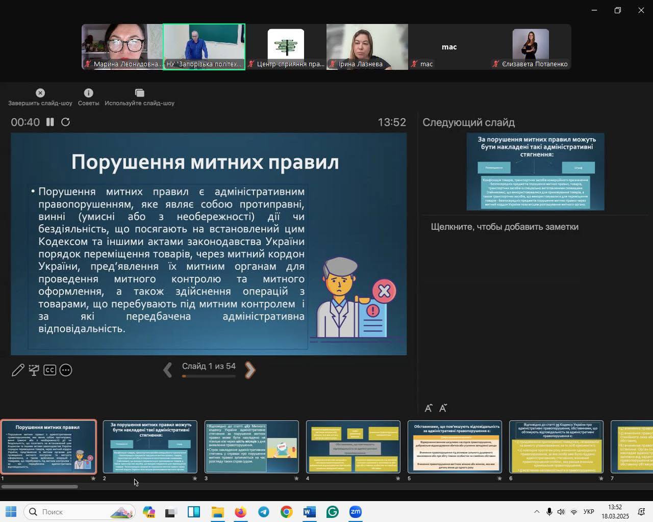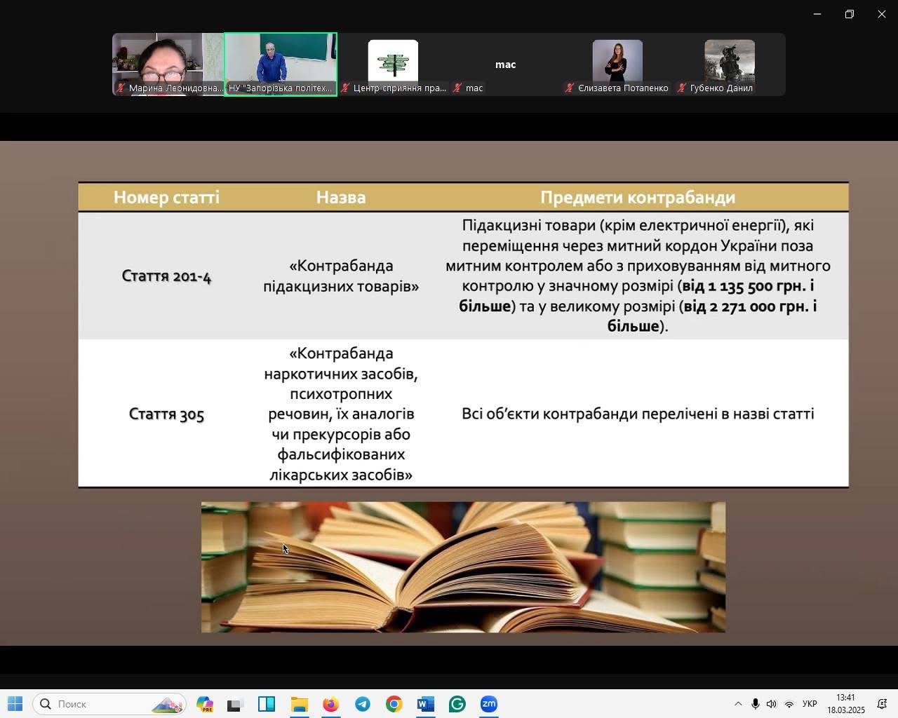 18 березня 2025 року доцент кафедри конституційного, адміністративного та трудового права, к.ю.н., доц. Смолярова М.Л. разом із студентами юридичного факультету відвідала гостьову лекцію на тему: «Боротьба з контрабандою та порушеннями митних правил в митній системі України». Лекцію організовано за аніціативи Центра сприяння працевлаштуванню студентів та випускників НУ «Запорізька політехніка». Захід відбувся у змішаному форматі – в аудиторії 352 та на платформі Zoom.