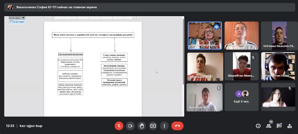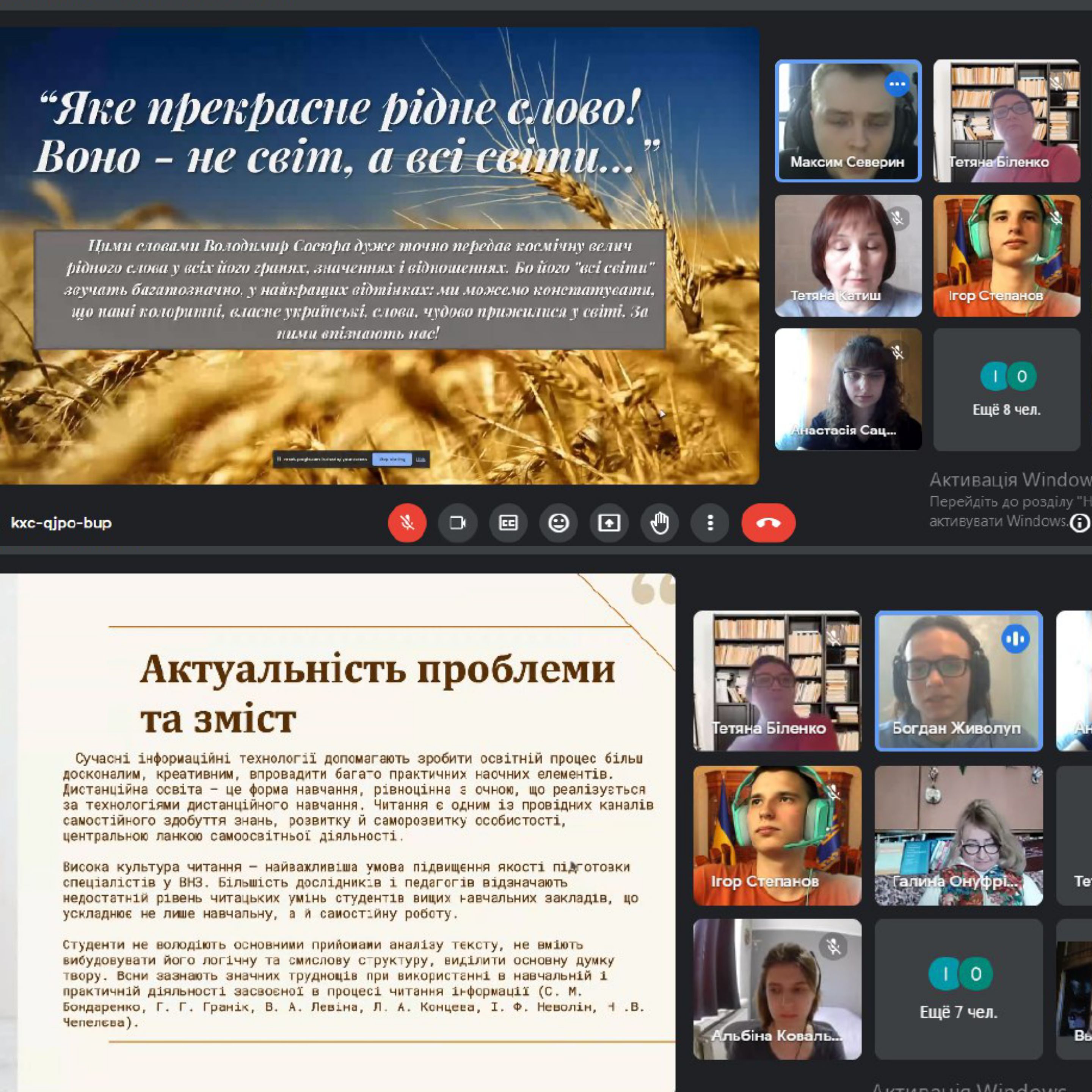 З науковими доповідями виступили виконавець НДР 06211 доцент кафедри Ірина ВОРОНЮК і керівник НДР. У підготовленій за матеріалами проведеного дослідження віртуальній презентації Ірини ВОРОНЮК було подано зібраний та впорядкований виконавицею ілюстративний матеріал про лексико-семантичні та граматичні особливості вузькоспеціальних термінів у галузі спорту. Увагу було зосереджено на процесах відродження в комунікації питомої термінолексики в цій сфері, що є актуальним для студентів відповідної спеціальності на практичних заняттях з УМПС.