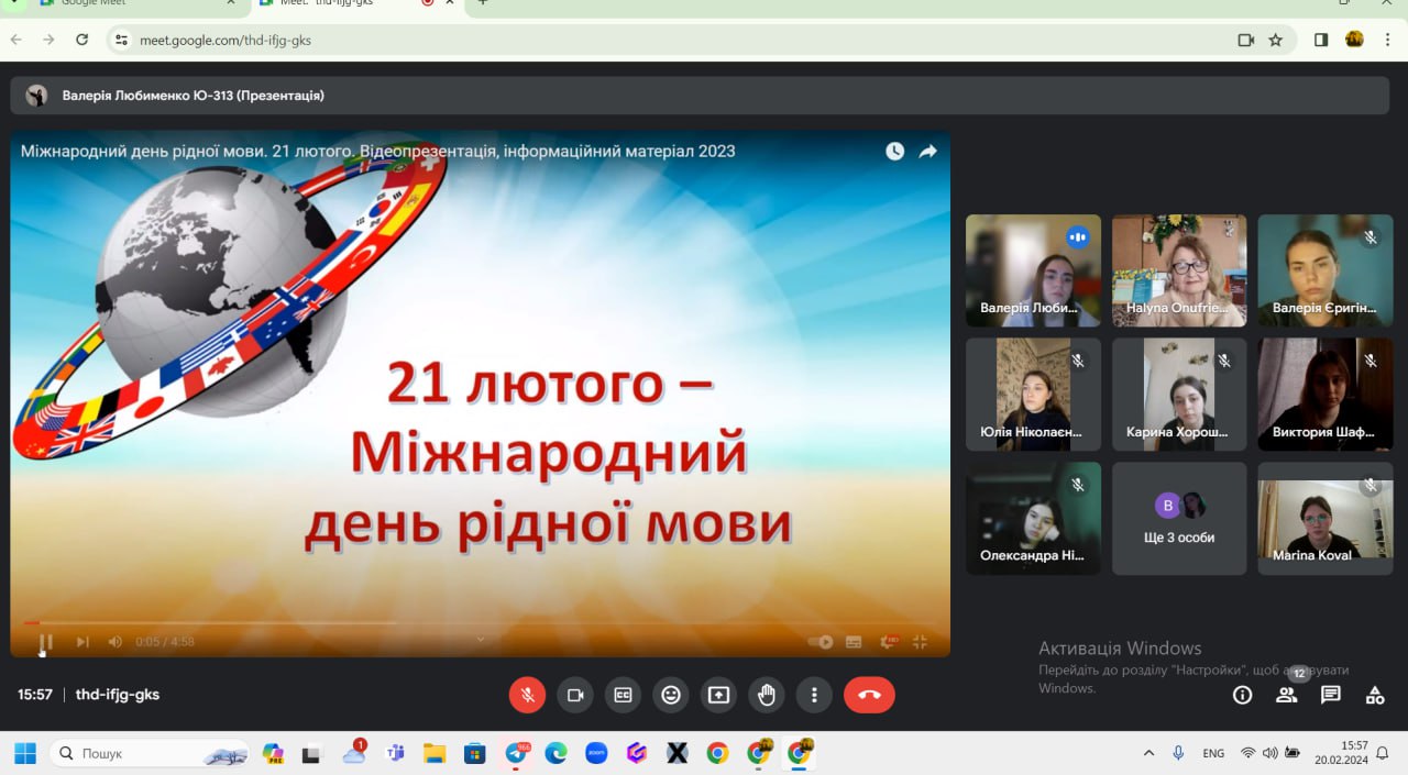 З нагоди цього унікального свята в навчальних групах першого курсу ЮФ-113, 313 доцент кафедри Галина Онуфрієнко організувала інформаційно актуальні відеопрезентації з цікавими фактами про різні мови світу, яких у ХХІ столітті нараховується понад 7 тисяч. Після коментованого огляду слайдів у групах проведено інтерактивну бесіду про функції української державної мови під час воєнного стану в Україні і чинники поширення української мови у сучасному європейському просторі. Студентам також запропоновано оглянути підготовлені науковою бібліотекою університету і розміщені на You Tube відеоматеріали, зокрема віртуальні книжкові галереї "Яке прекрасне рідне слово! Воно - не світ, а всі світи", " Ми - українці, і мова наша - українська".