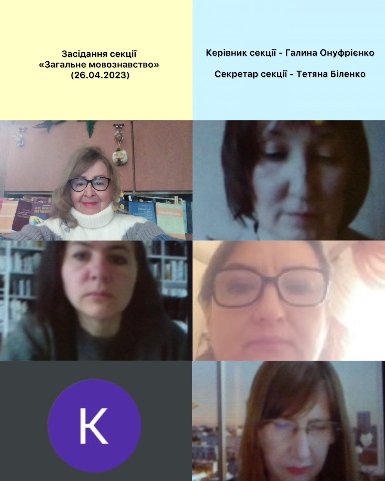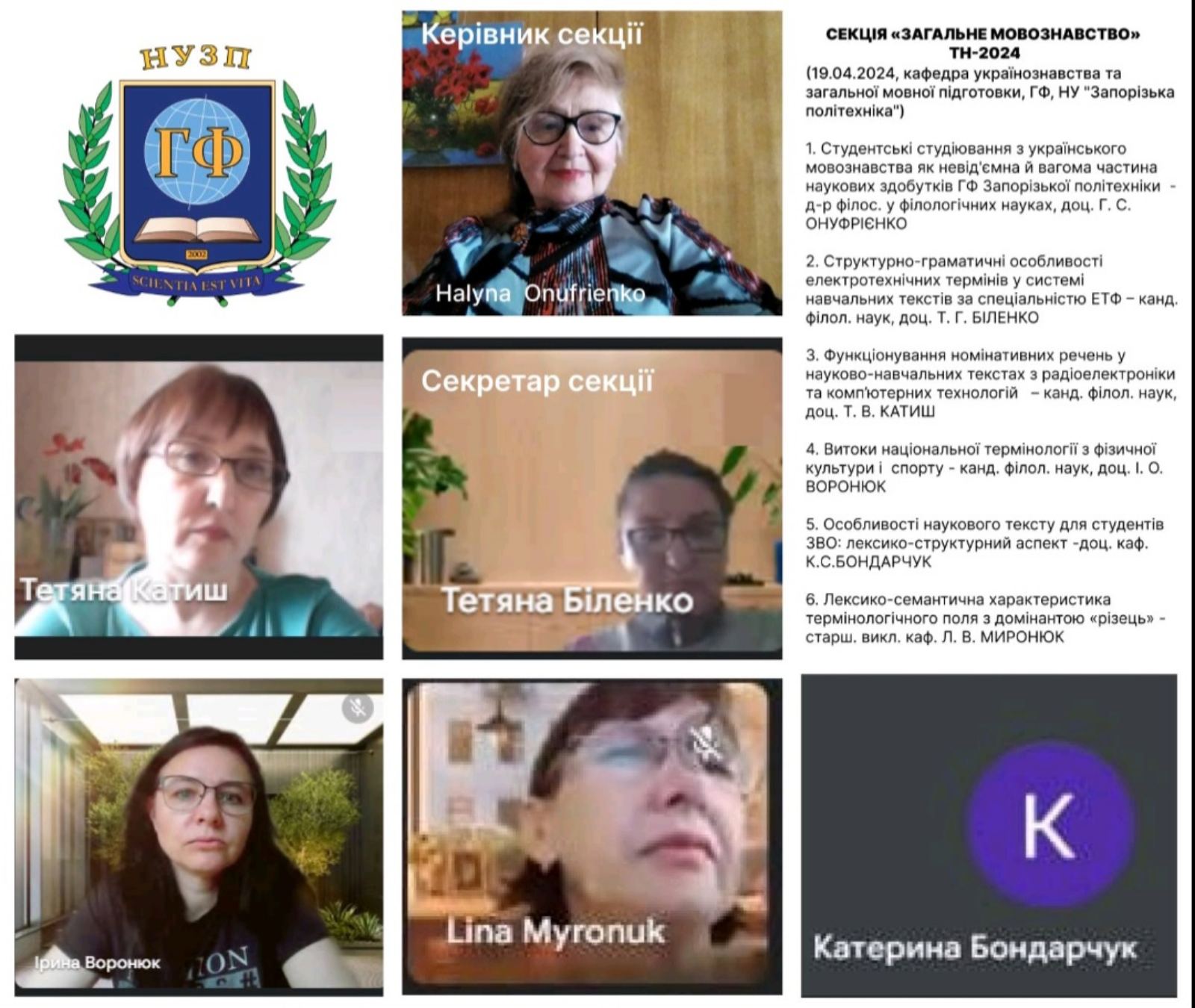 Засідання секції "Загальне мовознавство" на ГФ в межах щорічної університетської науково-практичної конференції "Тиждень науки" було проведено 19.04.2024 р. у дистанційному форматі на платформі Google meet з 15-00. Із повідомленнями виступили всі викладачі секції ЗМП. Фокус наукової уваги був зосереджений на актуальних питаннях фахового тексту українською мовою у сучасному освітньому процесі.