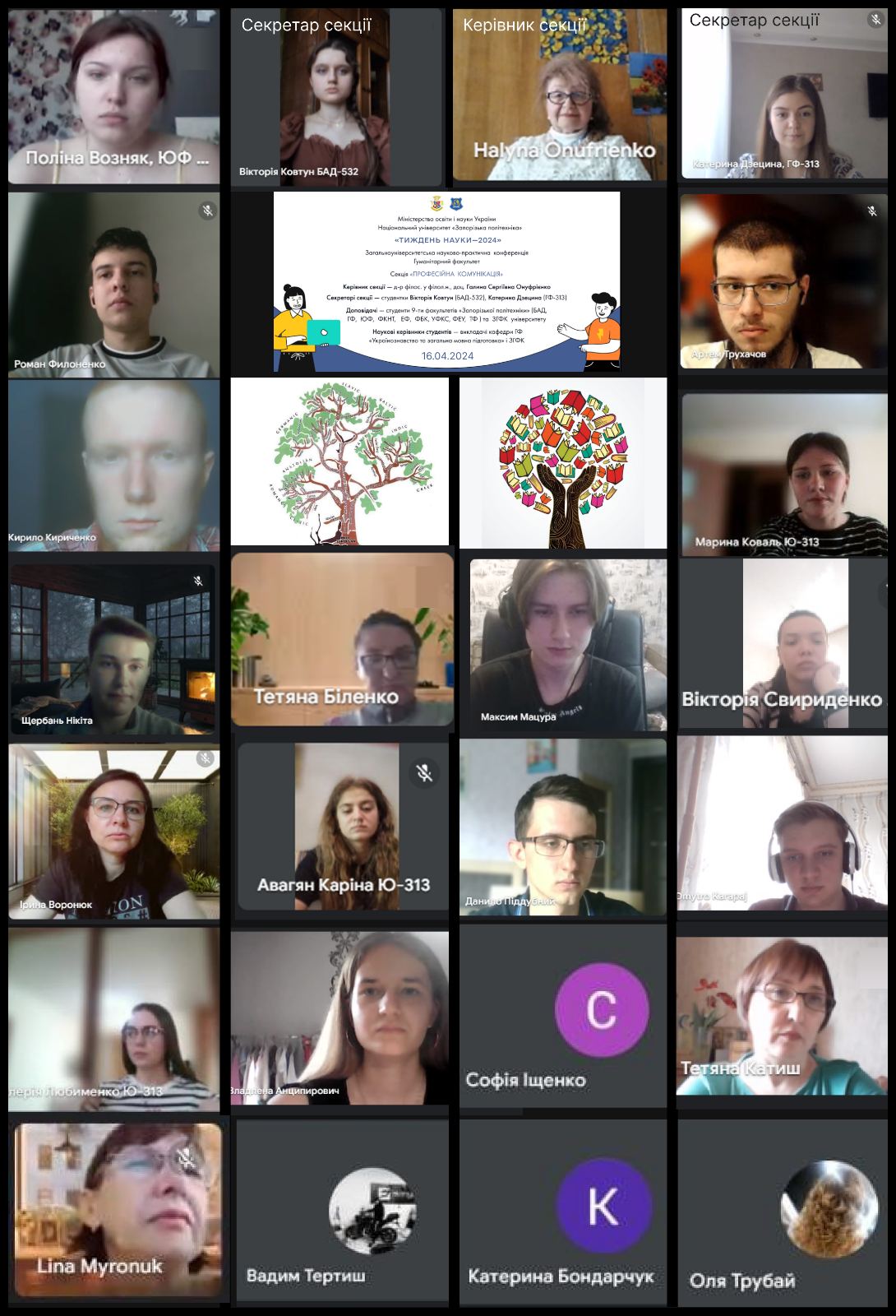Роботу студентської секції "Професійна комунікація" організувала доц. Галина Онуфрієнко. Їй допомагали секретарі секції - першокурсниця Катерина Дзецина (ГФ-313) і другокурсниця Вікторія Ковтун (БАД-532). Секція відбулася онлайн на освітній платформі Google meet 16.04.2024 р. з 15-00 відповідно до затвердженого графіку.