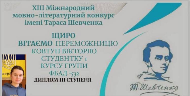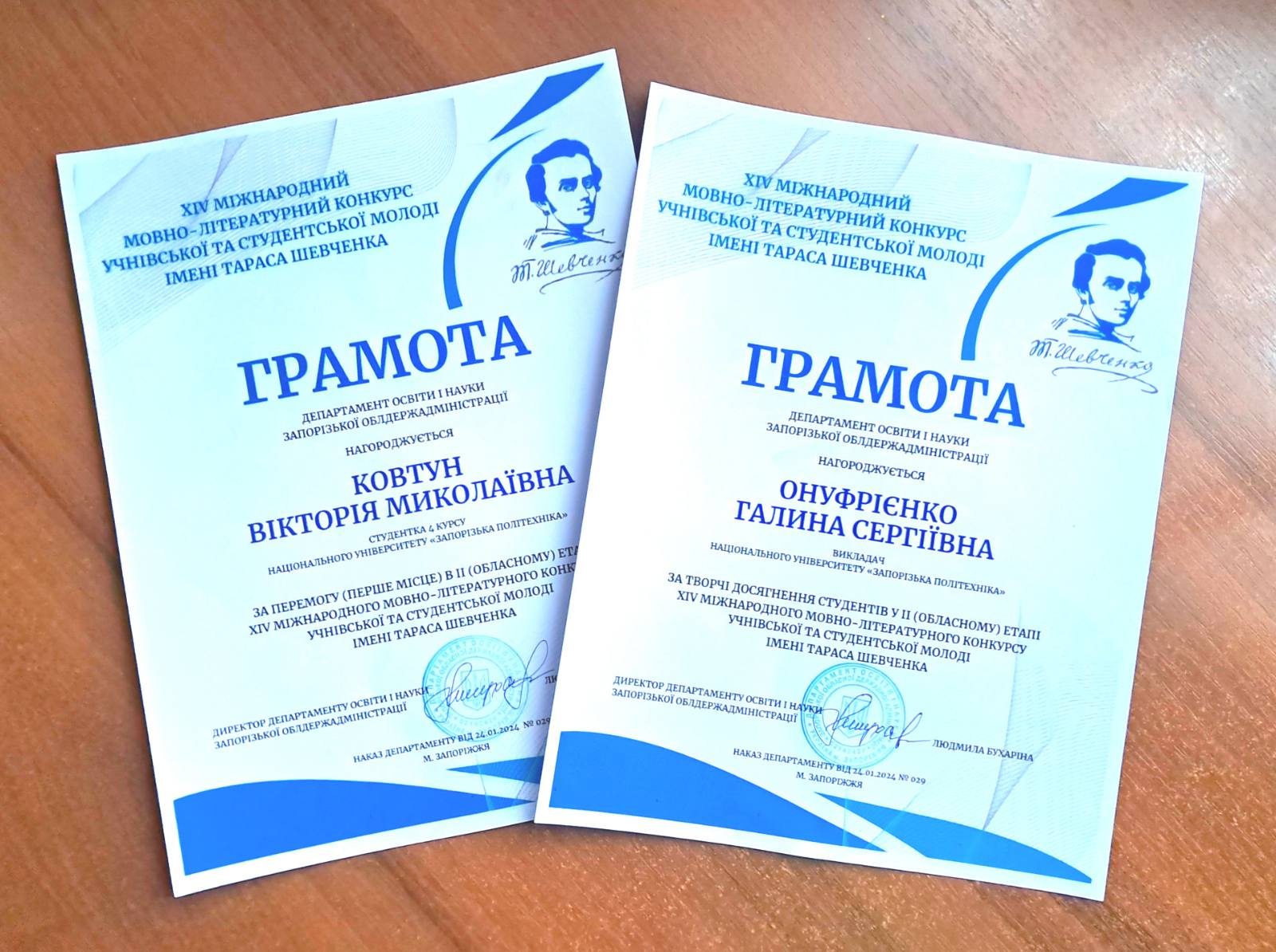 Студентка 2 курсу Запорізької політехніки Вікторія Ковтун здобула перемогу, як минулого року, під науковим керівництвом доктора філософії, доцента кафедри Галини Онуфрієнко на фінальному етапі ХІV Міжнародного мовно-літературного конкурсу учнівської та студентської молоді імені Тараса Шевченка.