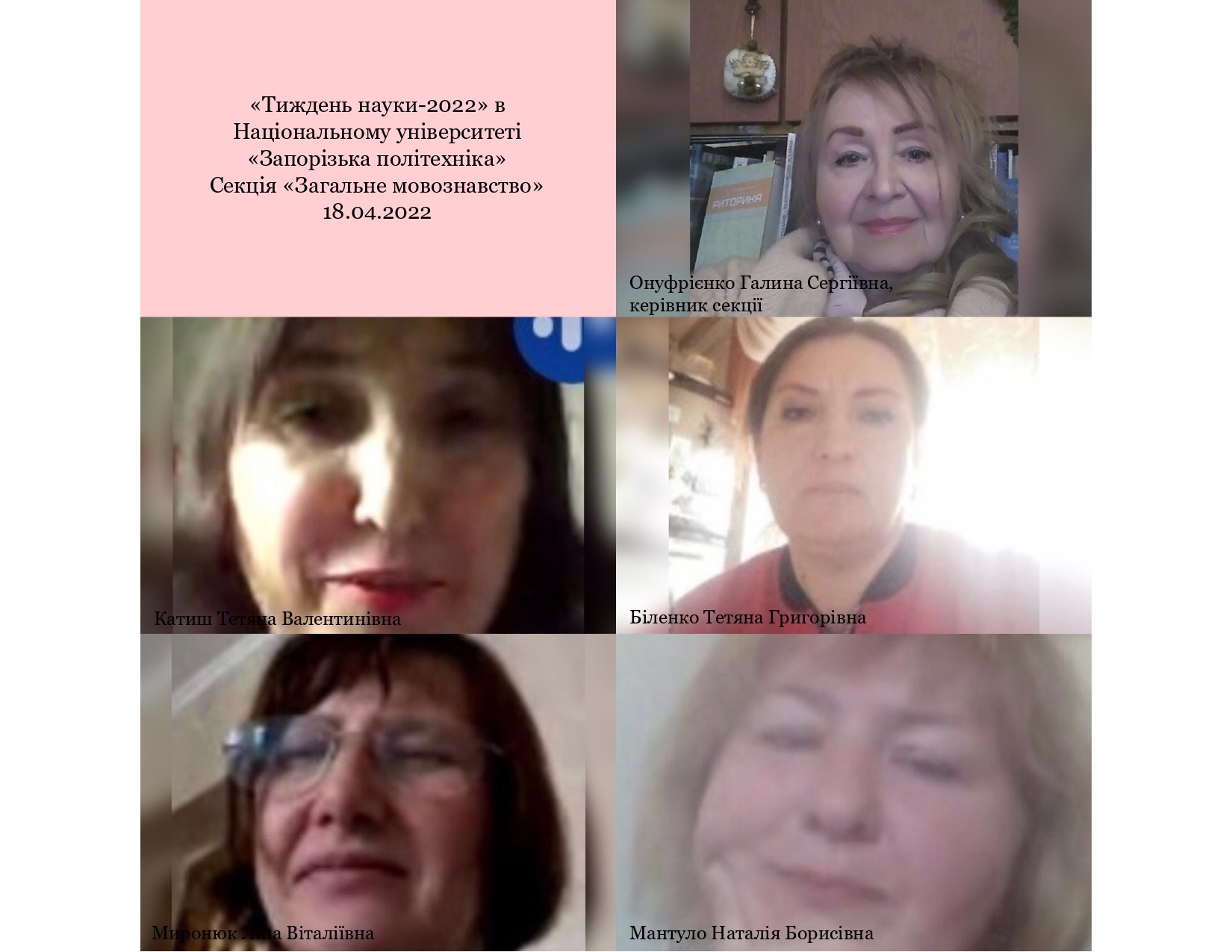 Учасники онлайн засідання секції "Загальне мовознавство" на "Тижні науки- 2021" ( 19.04.2021, НУ"Запорізька політехніка", кафедра українознавства та ЗМП ) : керівник секції Г.С.Онуфрієнко, в.о.завідувача кафедри І.В.Чернова, секретар секції Т.Г.Біленко, І.О Воронюк.