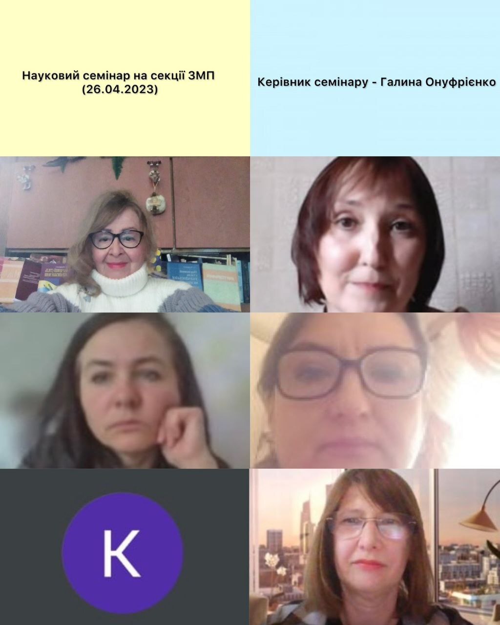 На початку семінару керівник НДР доцент Галина ОНУФРІЄНКО поінформувала про ділову нараду, організовану науковим відділом університету, щодо нових вимог до текстової частини всіх виконуваних в університеті НДР, передусім щодо обов'язковості перевірки їх на академічний плагіат, та узагальнила досягнуті проміжні результати на попередніх двох етапах цього дослідження секції ЗМП .