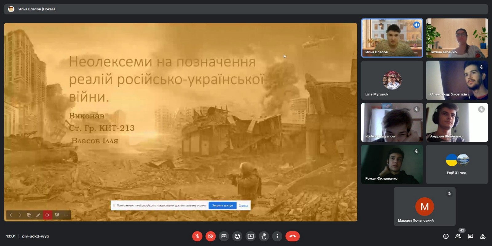 Найуспішніші виступи вирізнялися не тільки вільним викладом підготовленого матеріалу та самостійно підготовленими віртуальними презентаціями задля належної обґрунтованості в інформуванні, але й використанням інтерактивних технологій в публічній комунікації ("Українська мова в сузір'ї сучасних слов'янських мов: компаративний контекст і перспективи взаємодії"- В. Ковтун, БАД-532), аналізом джерельної бази дослідження ("Вартовий" українського слова: науковий потенціал фундаментальних мовознавчих праць Бориса Грінченка" - К. Дзецина, ГФ-313), коректним коментуванням дефініцій понять для визначення відмінностей між схожими, втім різними термінами ("Терміни-словосполуки воєнний стан, стан війни, воєнний час як актуальний об'єкт порівняльного аналізу" - П. Возняк, Ю-112); порівнянням актуальної української й англійської лексики ("Семантична специфіка фразеологізмів у медійних текстах політичного спрямування 2022-2023 років" - Р. Філоненко, КНТ-113), галузевої термінології ("Особливості комп’ютерних новоутворень в англійській мові" - Д.Піддубний, КНТ-213), у сфері інтернет-комунікації ("Особливості українського молодіжного інтернет-сленгу" - А. Трухачов, БК-233).