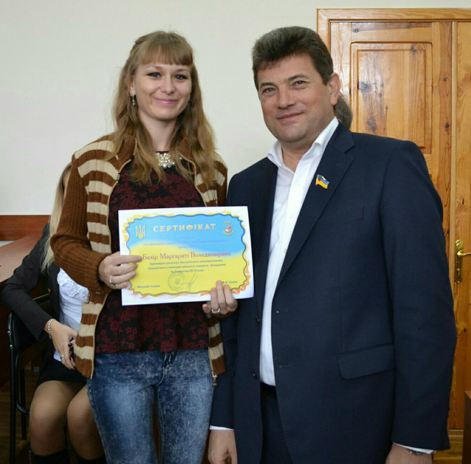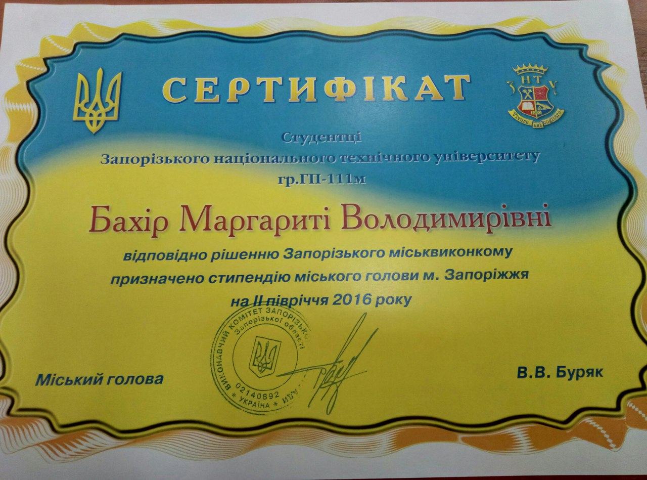 21 жовтня 2016 року у стінах Запорізького національного технічного університета відбулося нагородження найкращих студентів. Студентка магістратури юридичного факультету ЗНТУ Бахір Маргарита Володимирівна за результатами активної наукової роботи отримала стипендію міського голови м.Запоріжжя на ІІ півріччя 2016 року.