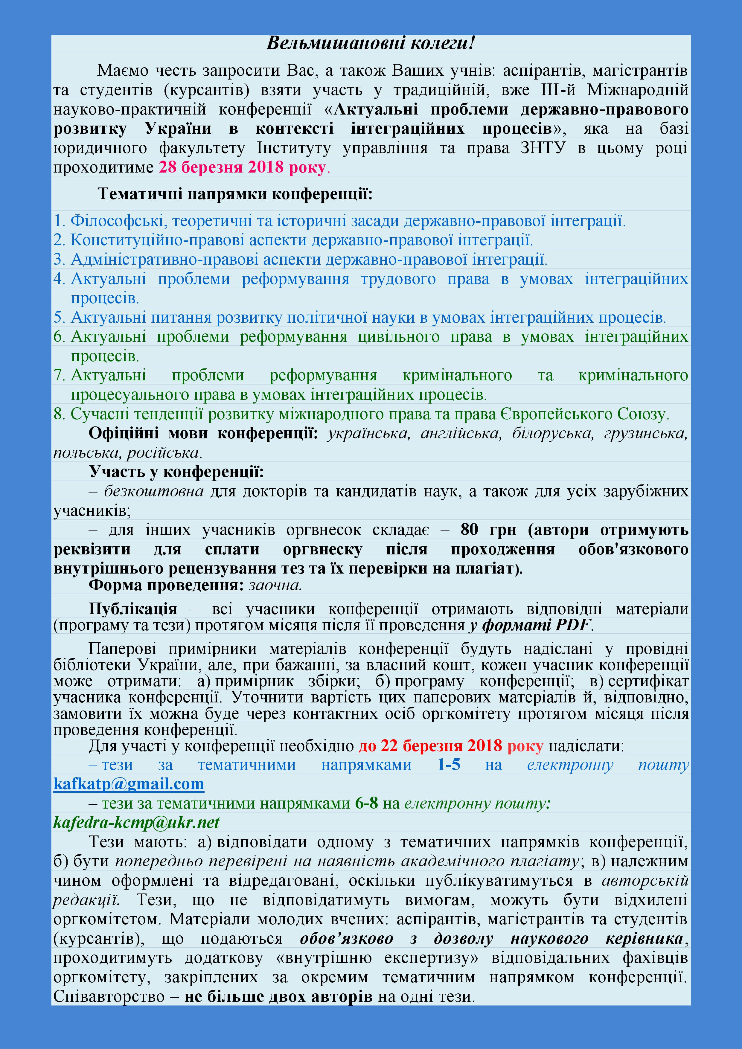 Запрошуємо до участі у ІІІ-й Міжнародній науково-практичній конференції «Актуальні проблеми державно-правового розвитку України в контексті інтеграційних процесів».