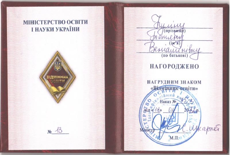 нагрудний знак "Відмінник освіти" (Наказ № 75-к від 18.04.2022 р.)