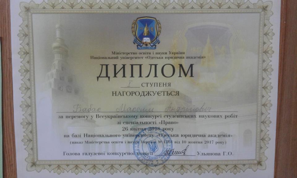 За підсумками ІІ туру Всеукраїнського конкурсу студентських наукових робіт з юридичних наук 2017-2018 н.р., який проходив на базі Національного університету «Одеська юридична академія» (м. Одеса) 26 квітня 2018 року переможцем було визнано студента 4 курсу юридичного факультету Бабака Максима Андрійовича з науковою роботою на тему: «Конституційна скарга як правова форма захисту основоположних прав та інтересів людини: зарубіжний та вітчизняний досвід» виконану ним під науковим керівництвом професора кафедри конституційного, адміністративного та трудового права, доктора юридичних наук, професора Бостана С.К..