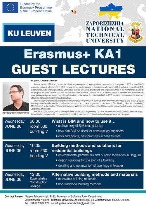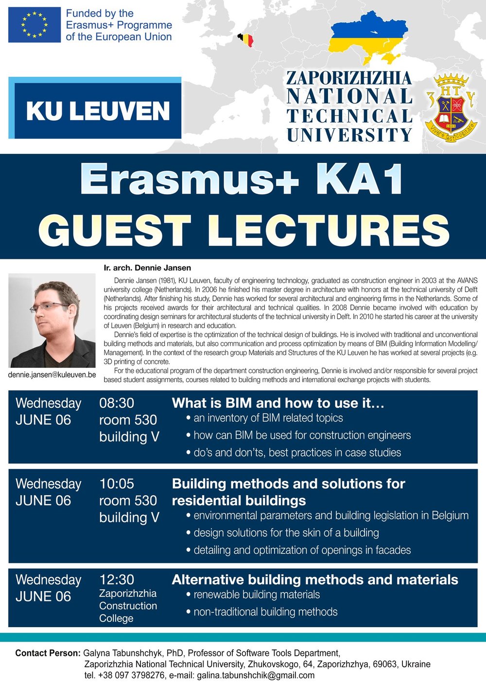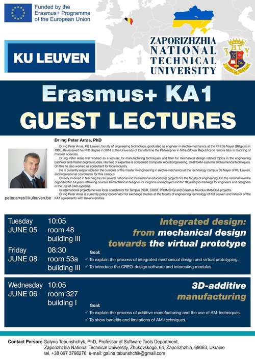 В рамках цієї програми з 4 по 10 червня Запорізький національний технічний університет відвідають представники Католицького університету Льовен: Петер Аррас – почесний професор ЗНТУ, викладач факультету інженерних технологій, співробітник міжнародного відділу; Денні Янсен – викладач факультету інженерних технологій.
