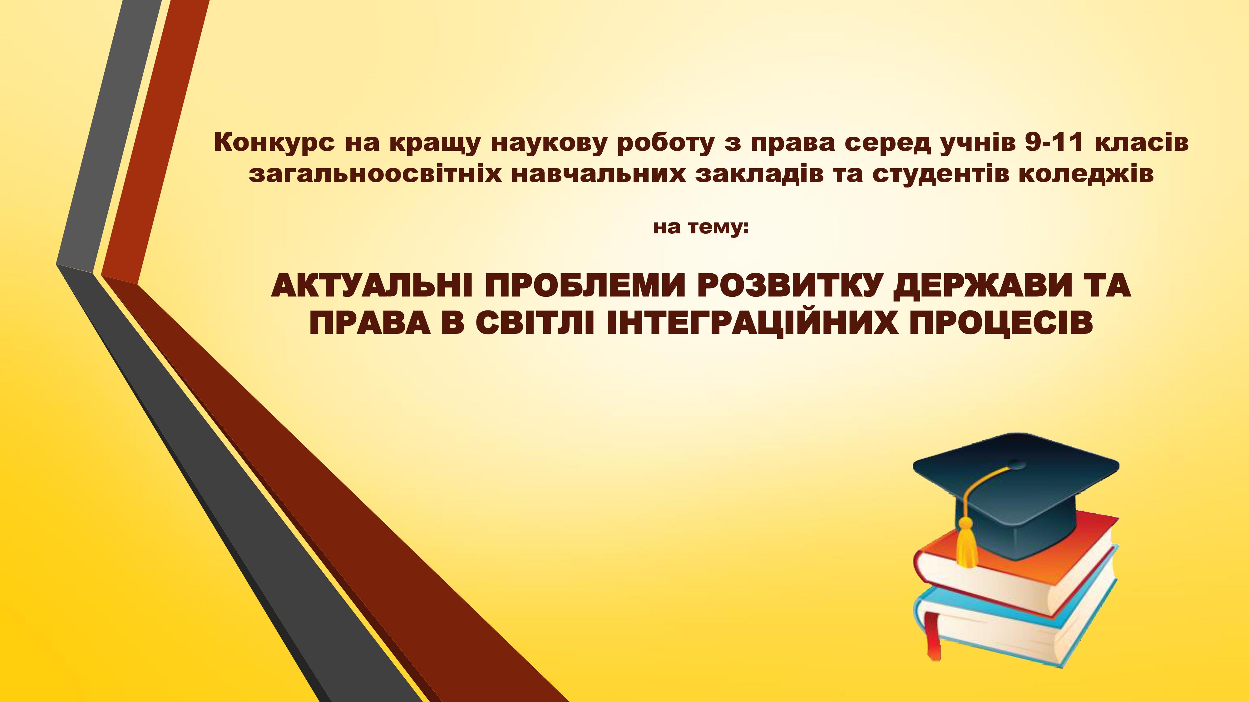 На юридичному факультеті Запорізького національного технічного університету в період з 15 квітня до 30 квітня 2019 року буде проводитися конкурс на кращу наукову роботу з права серед учнів 9-11 класів загальноосвітніх навчальних закладів та студентів коледжів. Тема конкурсу: «Актуальні проблеми розвитку держави і права в світлі інтеграційних процесів». Запрошуємо до участі в конкурсі учнів Вашого загальноосвітнього навчального закладу.