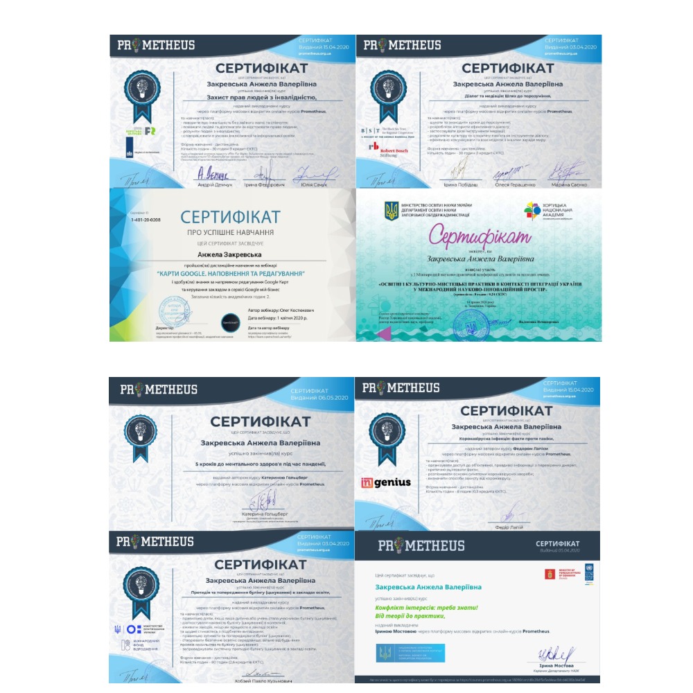 Студенти НУ "Запорізька політехніка" перейшли на дистанційне навчання через COVID-19: молодь займається на електронній освітній платформі Moodle і слухає лекції по Skype. Не зважаючі на те, що пари зараз перенесені в режим онлайн, наші студенти як і раніше відвідують їх і виконують завдання, а крім цього, у них звільнилося кілька додаткових годин, які раніше витрачалася на дорогу і багатьом вдається провести їх з користю. Гарний приклад того, як можна під час карантину проводити час з користю демонструє студентка 2 курсу, староста групи СН-218 - Закревська Анжела, яка за цей короткий термін встигла взяти участь у різноманітних наукових конференціях, вебінарах, онлайн-курсах, де здобула важливі професійні компетенції, нові знання та отримала безліч корисних сертифікатів.
