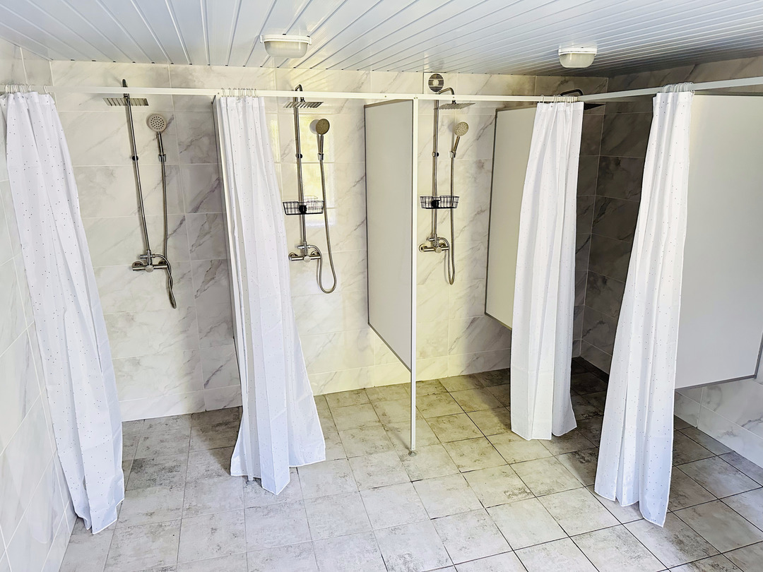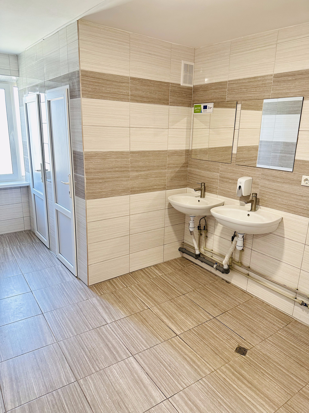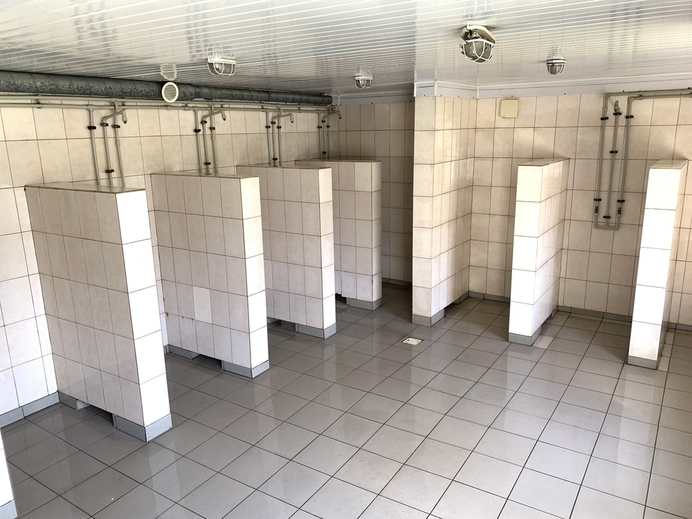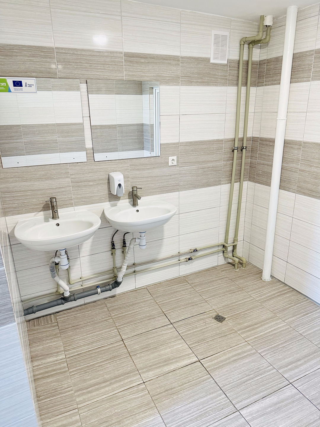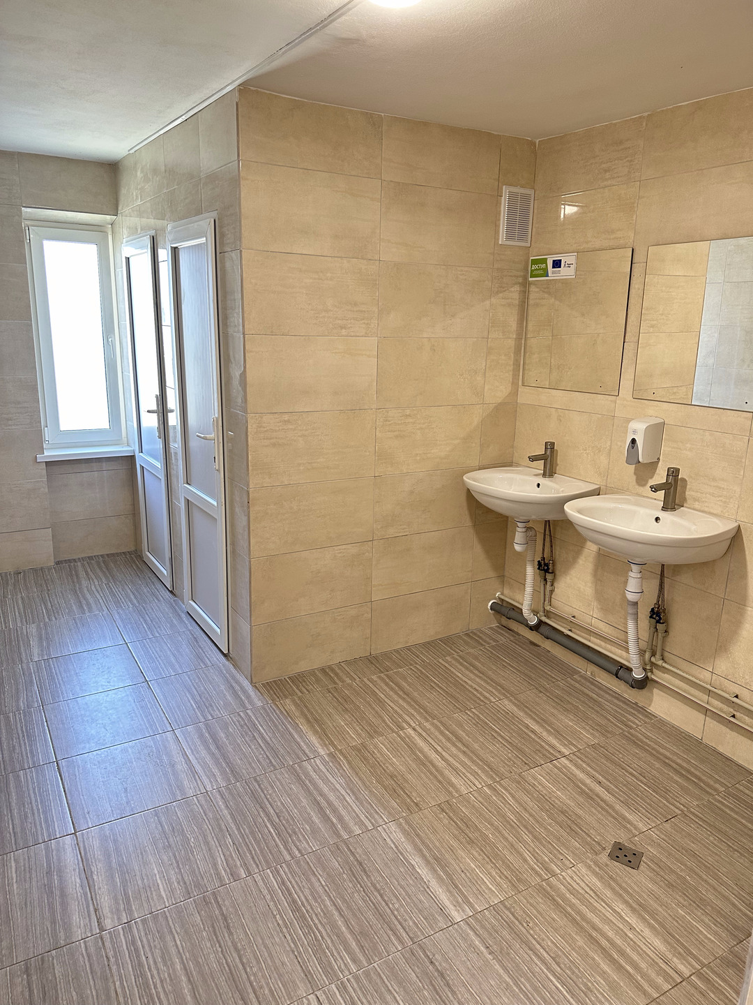 На першому поверсі розташована одна душова чоловіча, в якій функціонує вісім кабінок, та друга душова – жіноча на дванадцять кабінок.