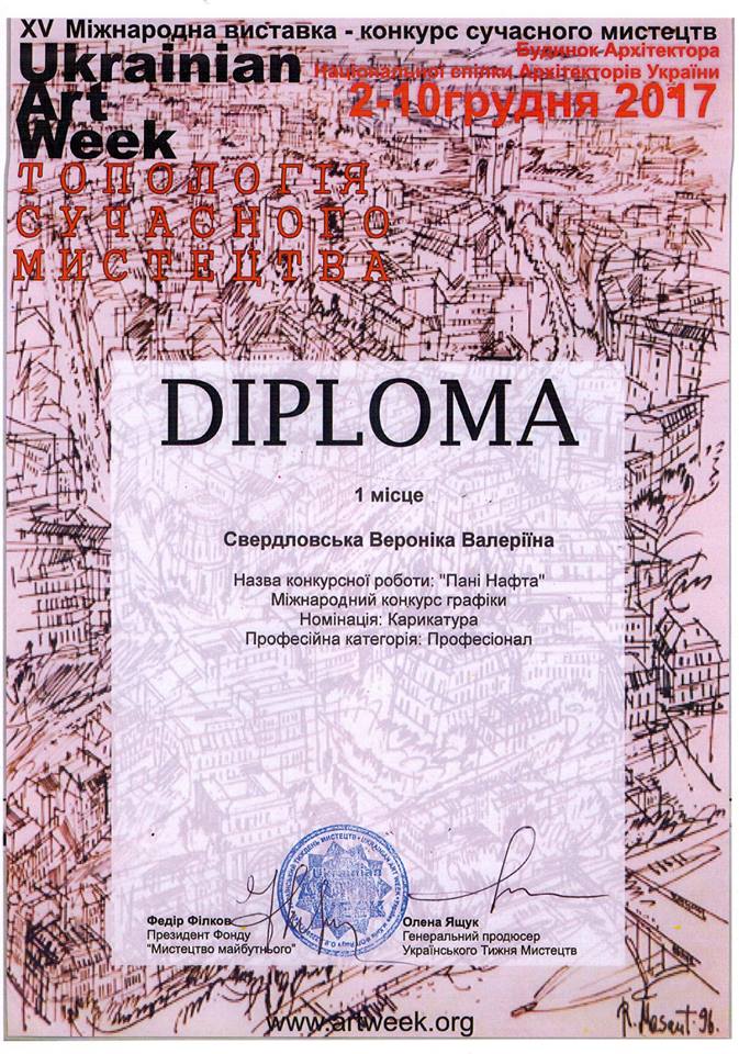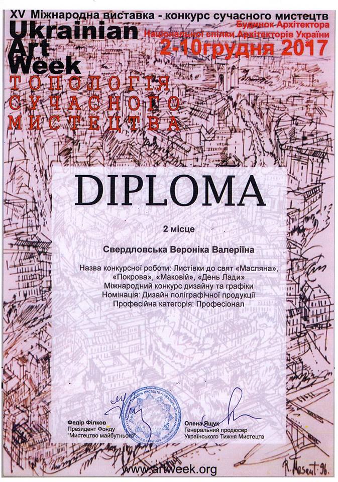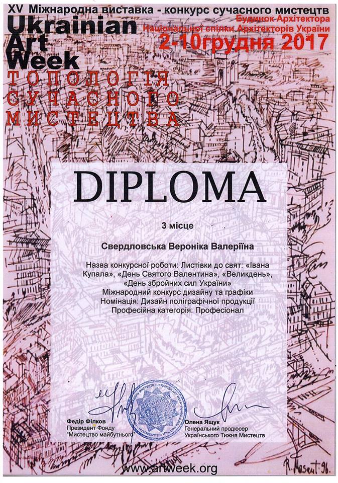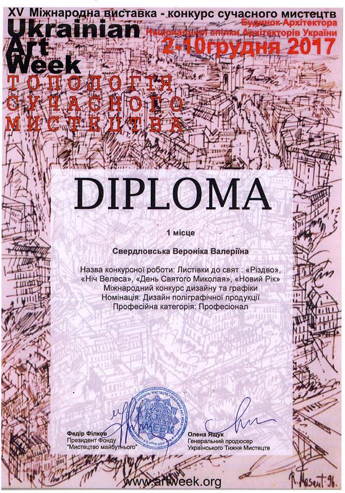 Студентка кафедри "Дизайн" Свердловська Вероніка Валеріївна прийняла участь у XV Міжнародній виставці-конкурсі сучасного мистецтва UKRAINIAN ART WEEK Топологія сучасного мистецтва та отримала призові місця. Дипломи додаються!!!