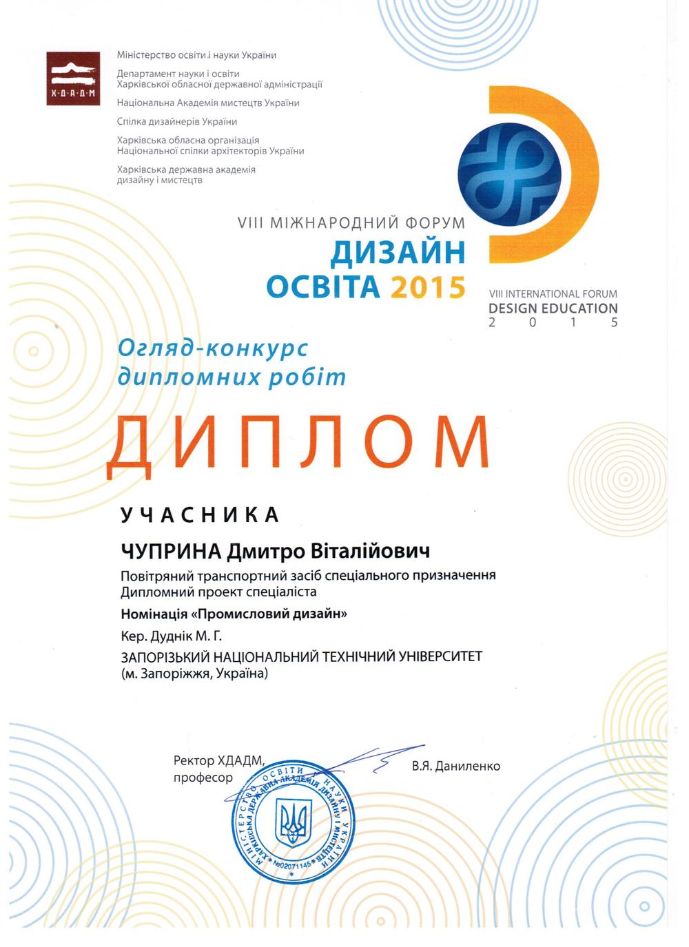 Чуприн Дмитро Віталійович отримав диплом III ступеня в номінації «Промисловий дизайн» за темою «Повітряний транспортний засіб спеціального призначення».