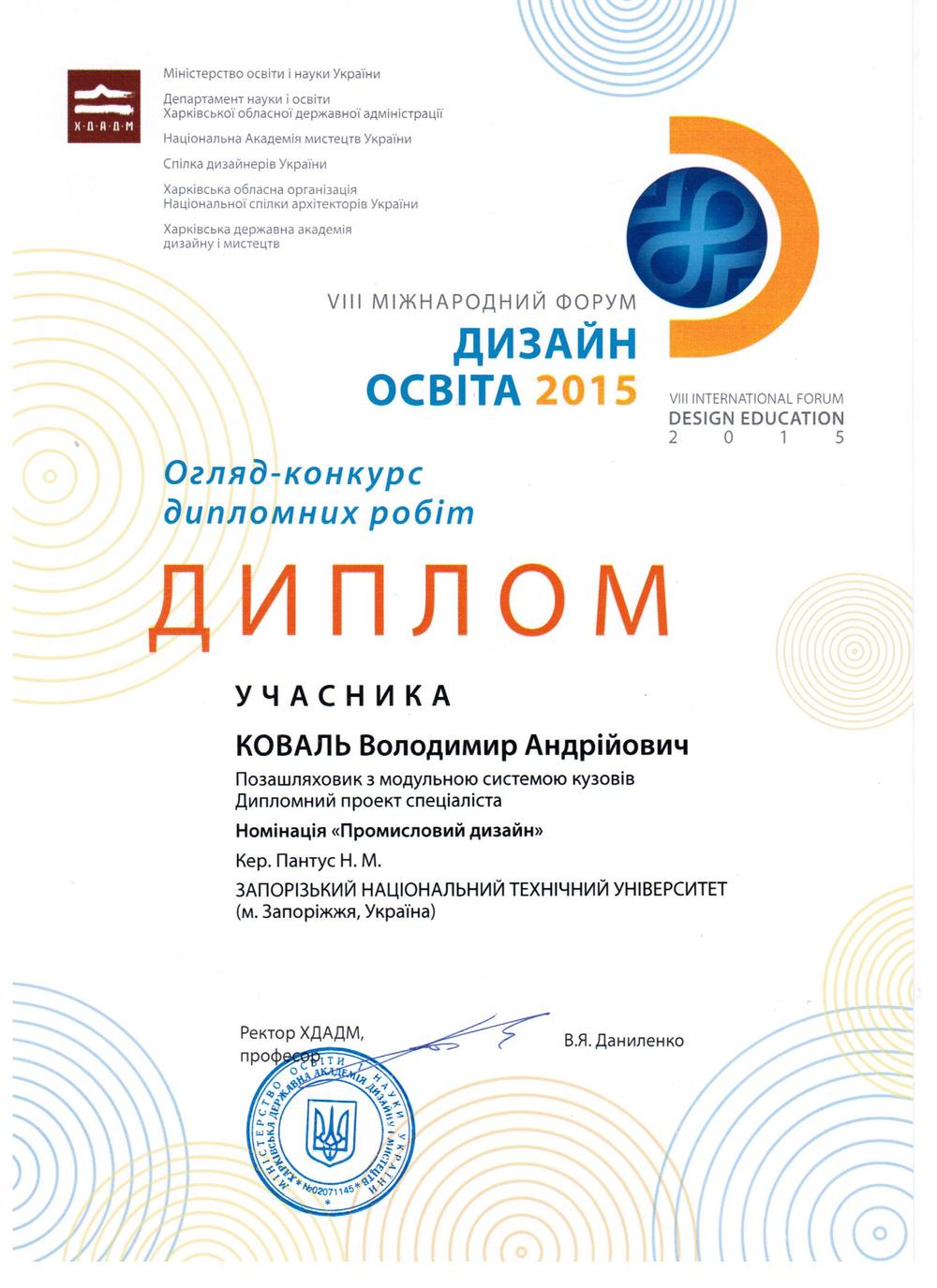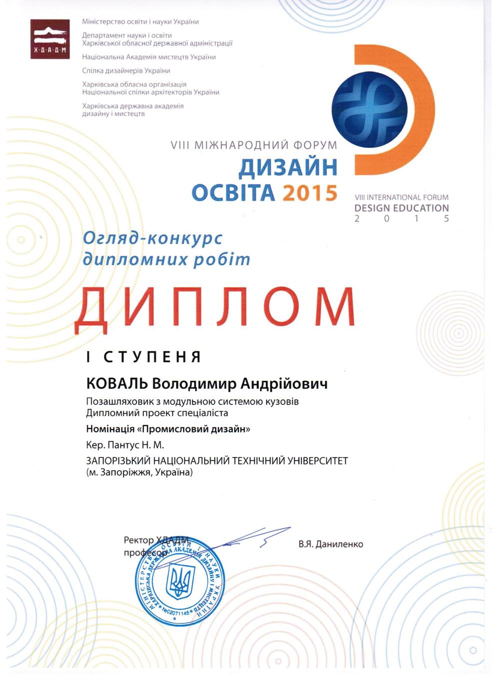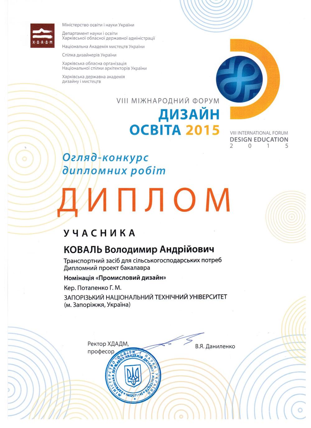 Коваль Володимир Андрійович отримав Диплом I ступеня у конкурсі дипломних робіт в номінації «Промисловий інтер'єр» за темою: «Позашляховик з модульною системою кузовів». А також отримав Диплом за участь в номінації «Промисловий дизайн» за темою «Транспортний засіб для сільськогосподарських потреб».