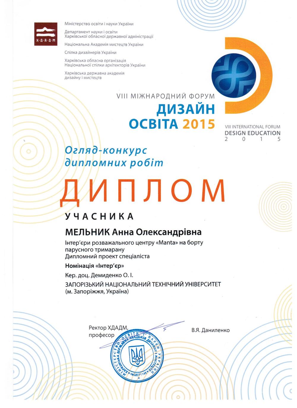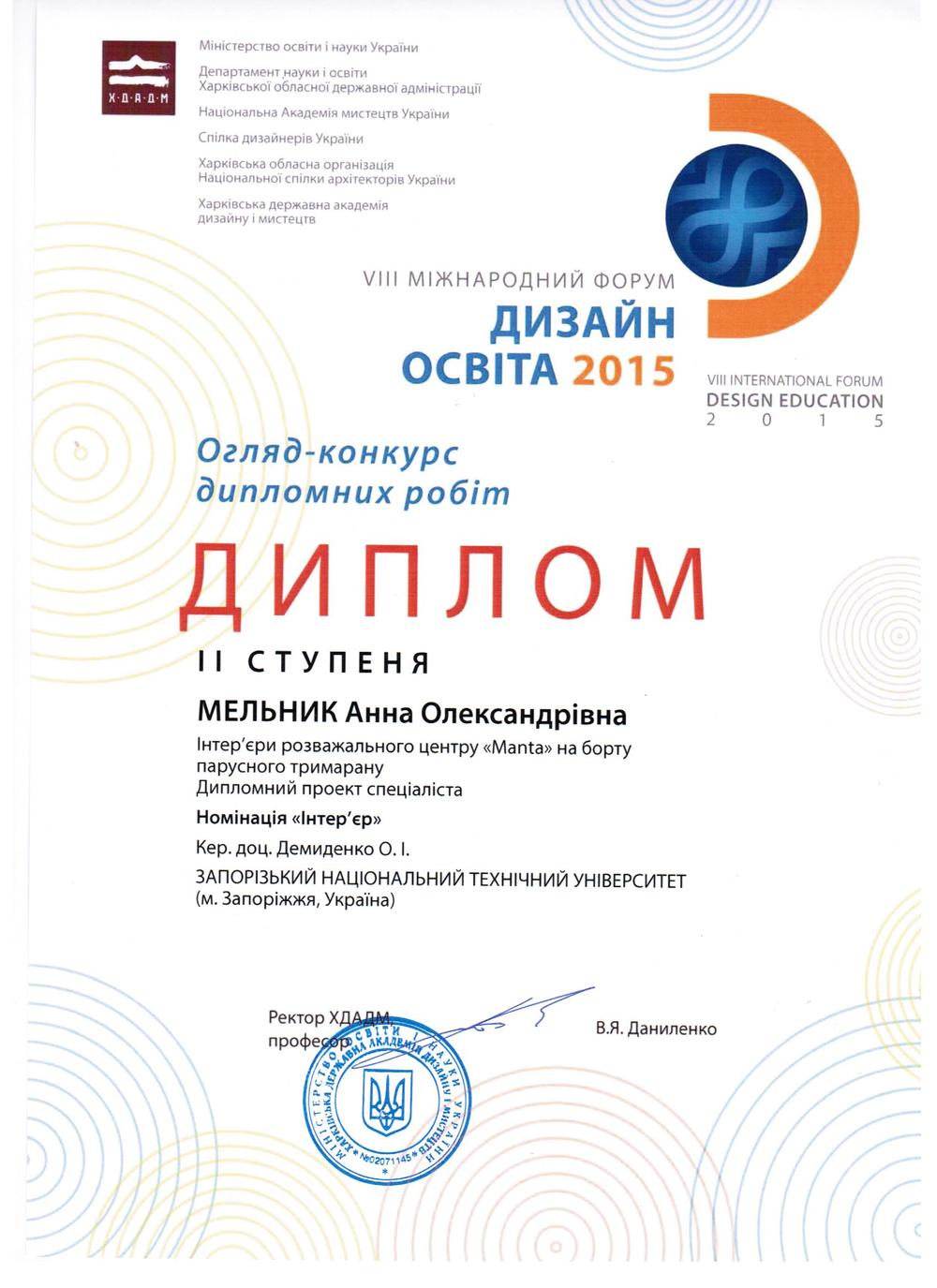 Мельник Анна Олександрівна отримала Диплом II ступеня у конкурсі дипломних робіт в номінації «Інтер'єр». Тема: «Інтер'єри розважального центру «Mantra» на борту парусного тримарану». А також заохочувальний Диплом за «цілісне представлення ігрового середовища».