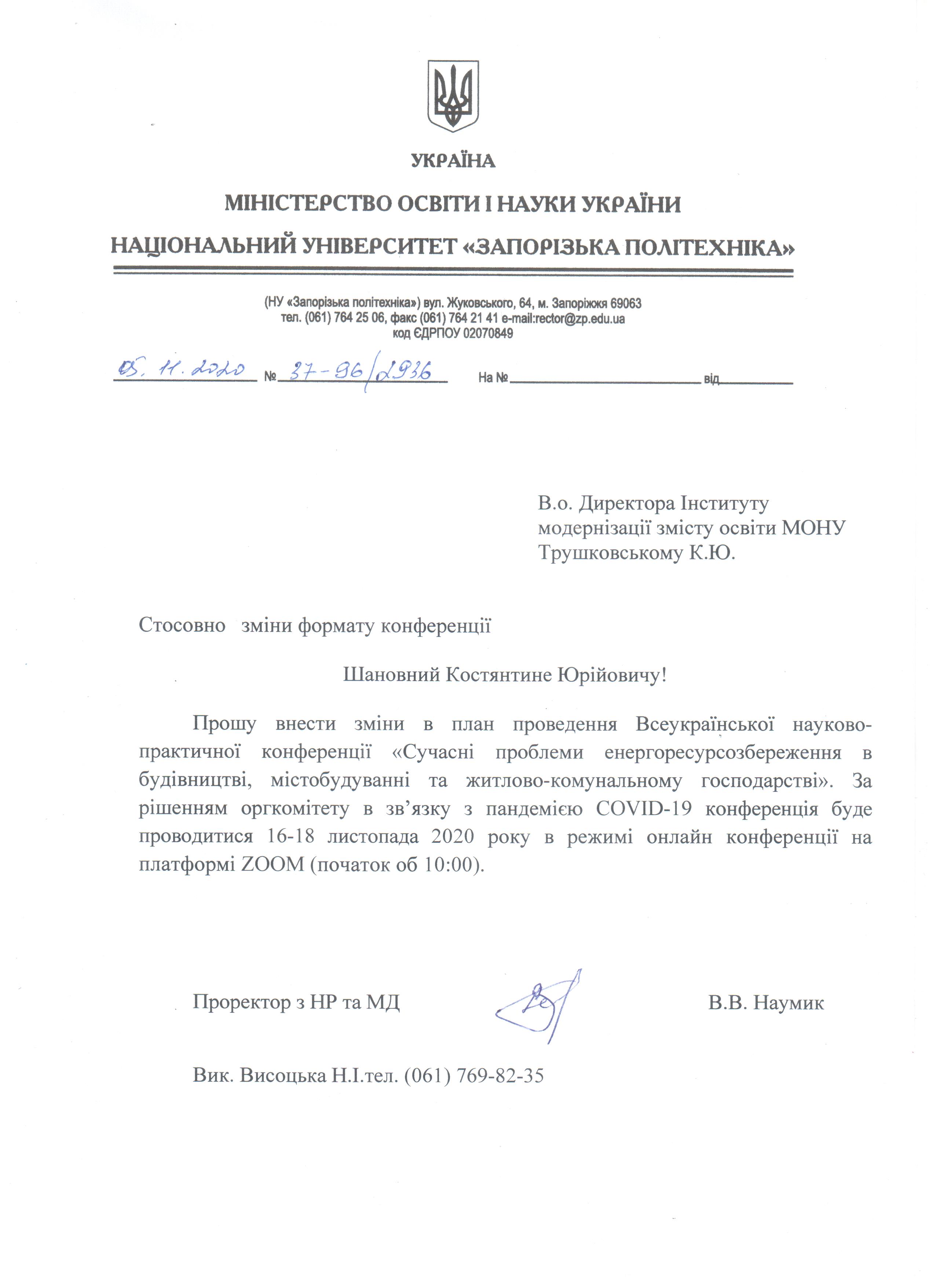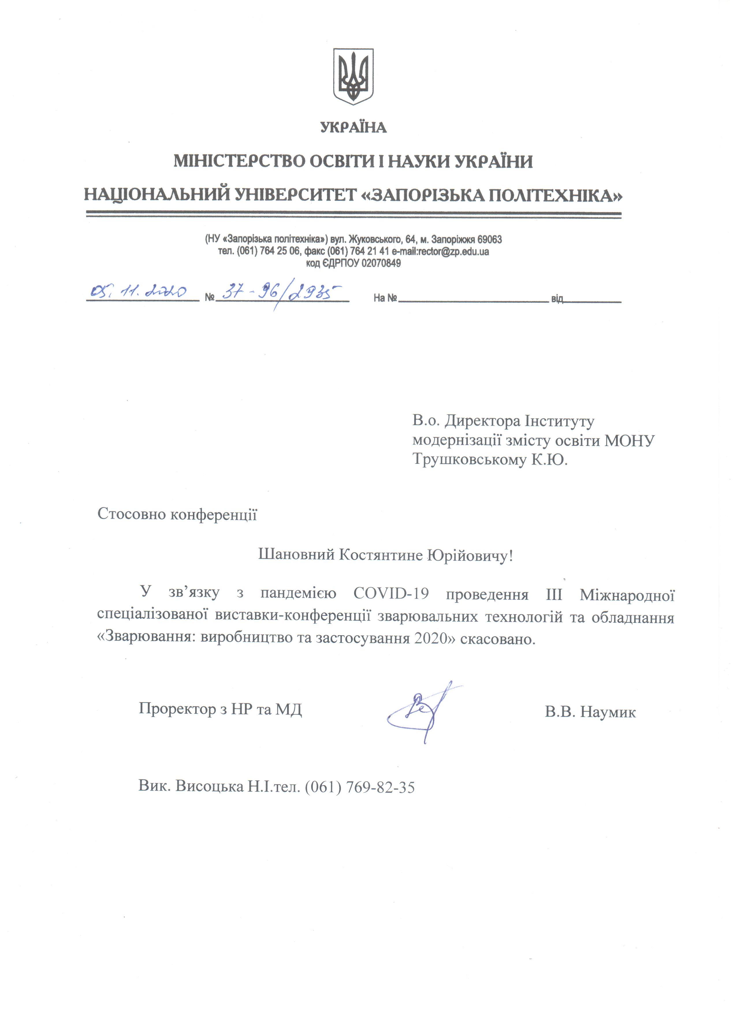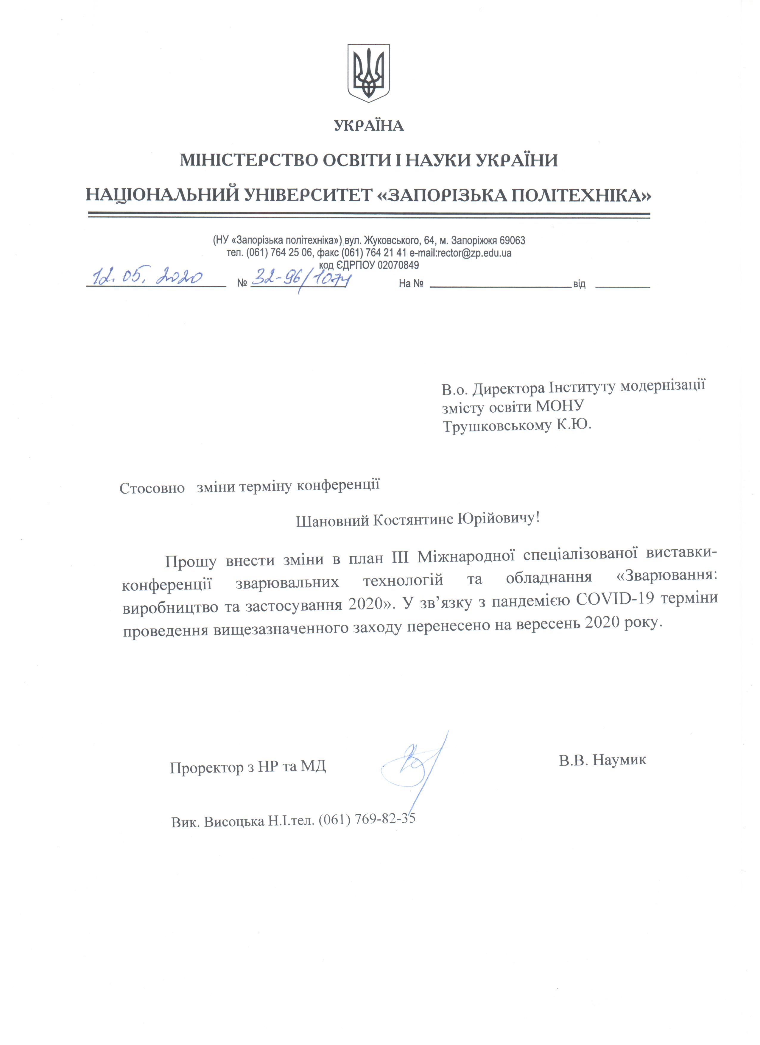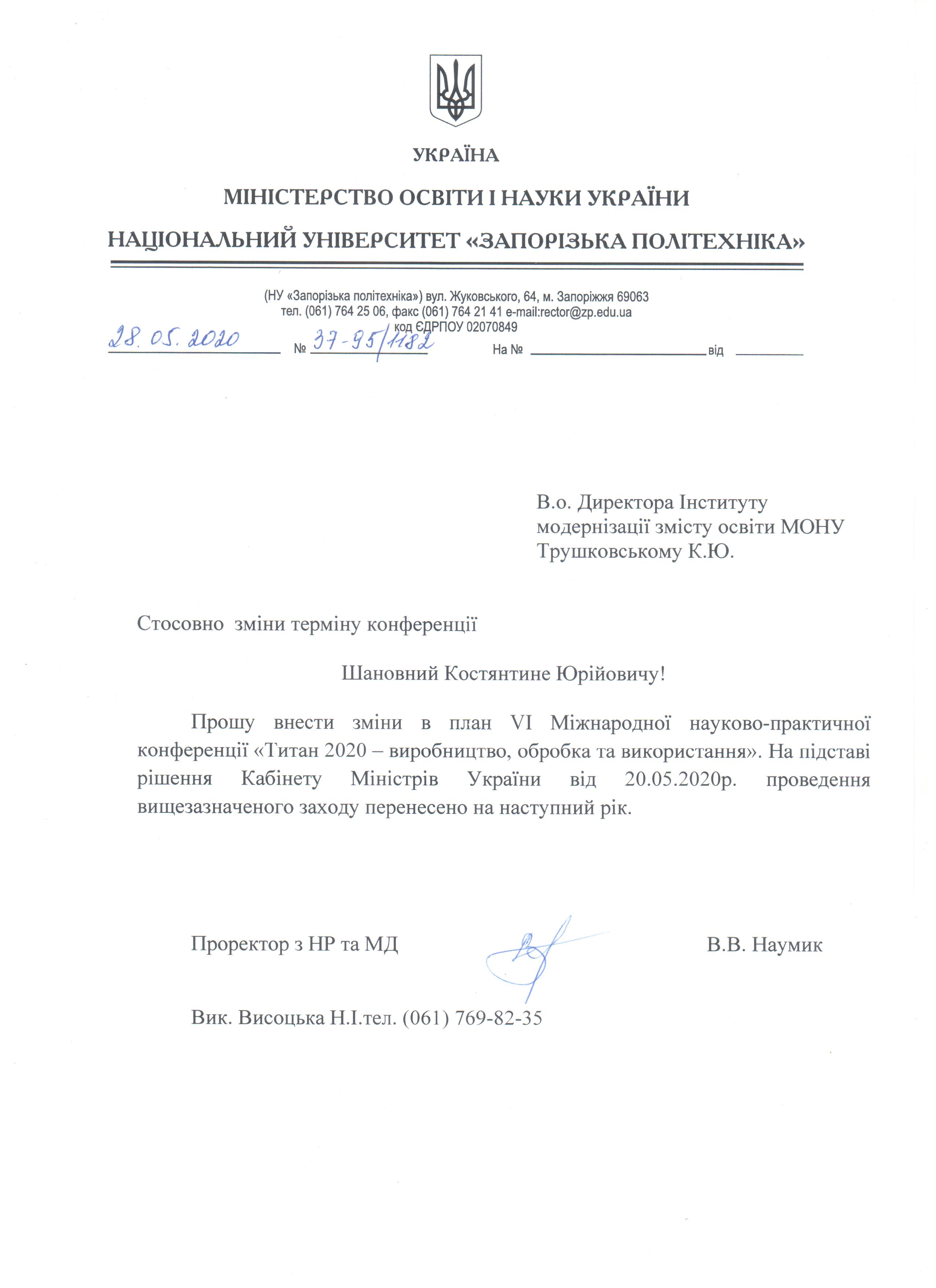 м. Запоріжжя, 15 травня, начальник ПІВ Висоцька Н.І., тел. (061) 769 82 35, е-mail: nvysost@zntu.edu.ua |