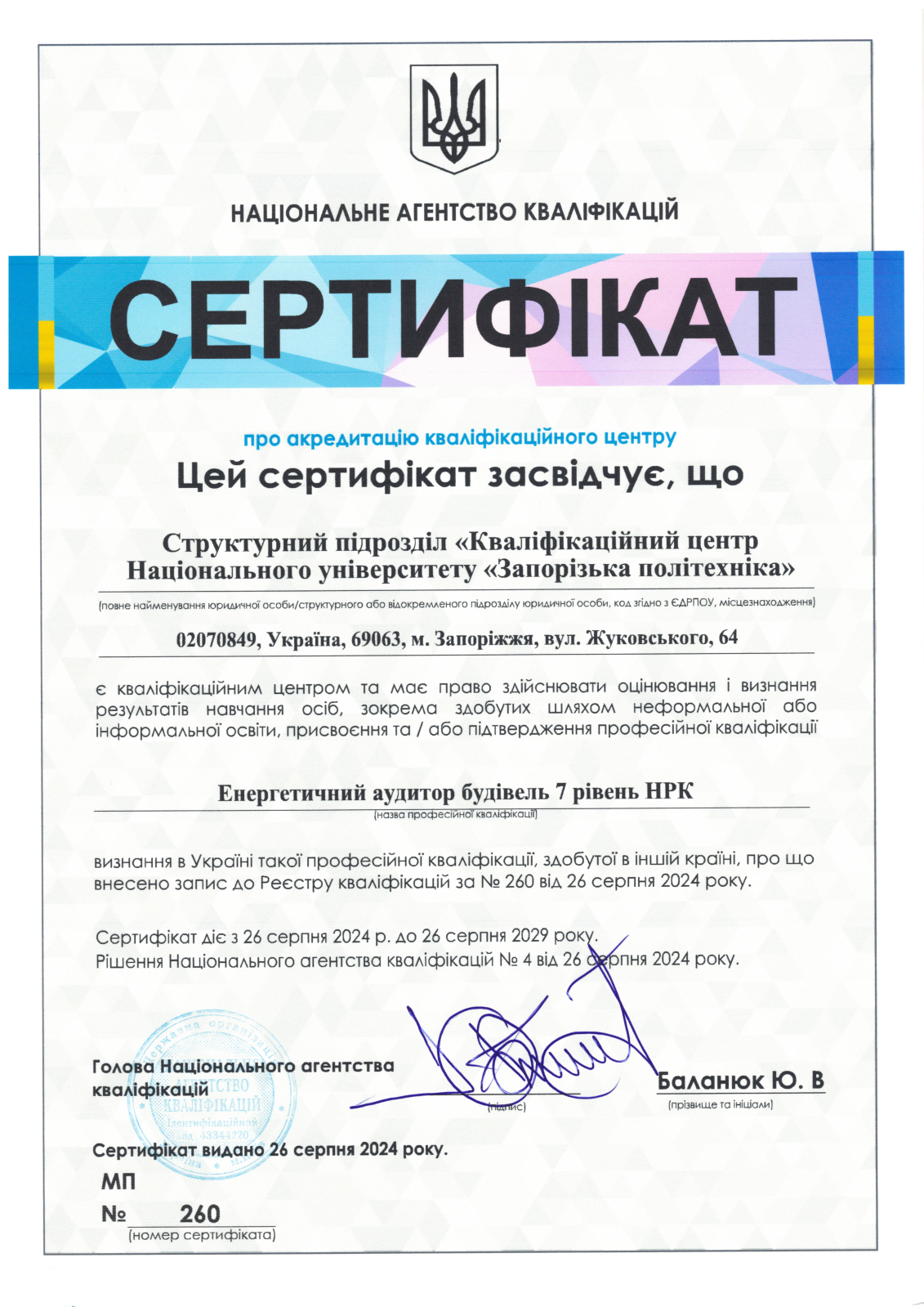 Національний університет «Запорізька політехніка» пройшов акредитацію Кваліфікаційного центру за кваліфікацією «Енергетичний аудитор будівель» (7 рівень НРК)!