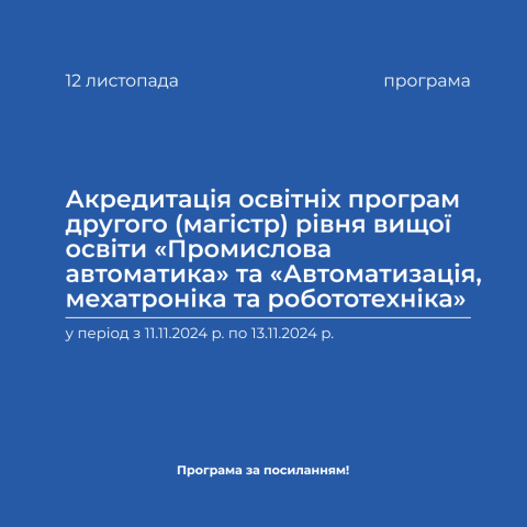 Ознайомитись з програмою проведення акредитаційної експертизи з використанням технічних засобів відеозв'язку у Національному університеті «Запорізька політехніка» освітньої програми «Промислова автоматика» (ID у ЄДЕБО 60380) та освітньої програми «Автоматизація, мехатроніка та робототехніка» (ID у ЄДЕБО 60378) спеціальності 174 Автоматизація, комп'ютерно-інтегровані технології та робототехніка другого (магістр) рівня вищої освіти у період з 11.11.2024 р. по 13.11.2024 р. можна за посиланням