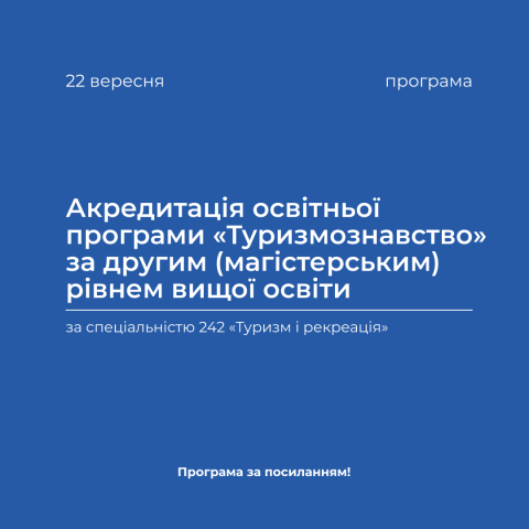 Ознайомитись з програмою проведення акредитаційної експертизи з використанням технічних засобів відеозв'язку у Національному університеті «Запорізька політехніка» освітньої програми «Туризмознавство» (ID у ЄДЕБО 4933) за спеціальністю 242 «Туризм і рекреація» за другим (магістерським) рівнем вищої освіти у період з 21.09.2023 р. по 23.09.2023 р. Можна за посиланням: https://old.zp.edu.ua/