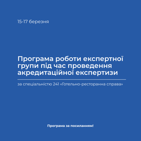 Програма роботи експертної групи під час проведення акредитаційної експертизи у віддаленому (дистанційному) режимі з використанням технічних засобів відеозв'язку у Національному університеті «Запорізька політехніка» за спеціальністю 241 «Готельно-ресторанна справа»: https://drive.google.com/file/d/1NcgLhodSZzCflKE1PN7kS2kApy2Uv7s_/view?usp=sharing