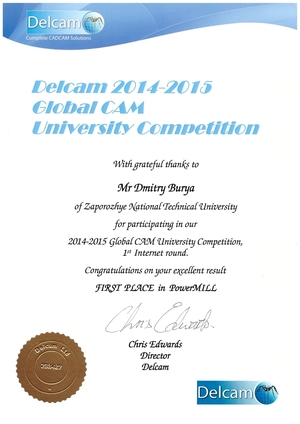 Другу винагороду для ЗНТУ отримав магістр кафедри «Металорізальні верстати та інструмент» Буря Дмитро за перше місце серед українських університетів у міжнародній олімпіаді 2014-2015 Global CAM University Competition (розробка керуючих програм для верстатів з ЧПК).