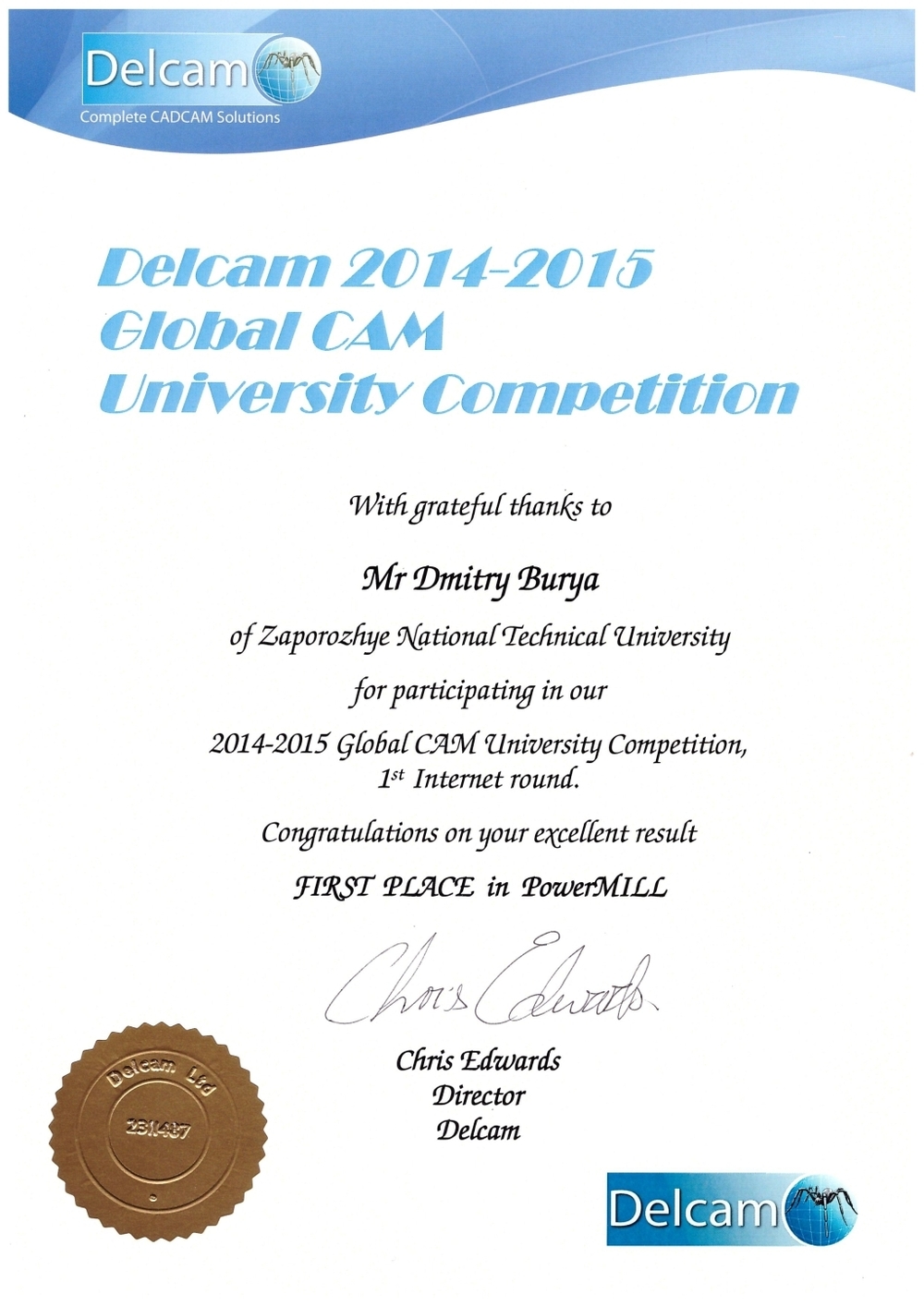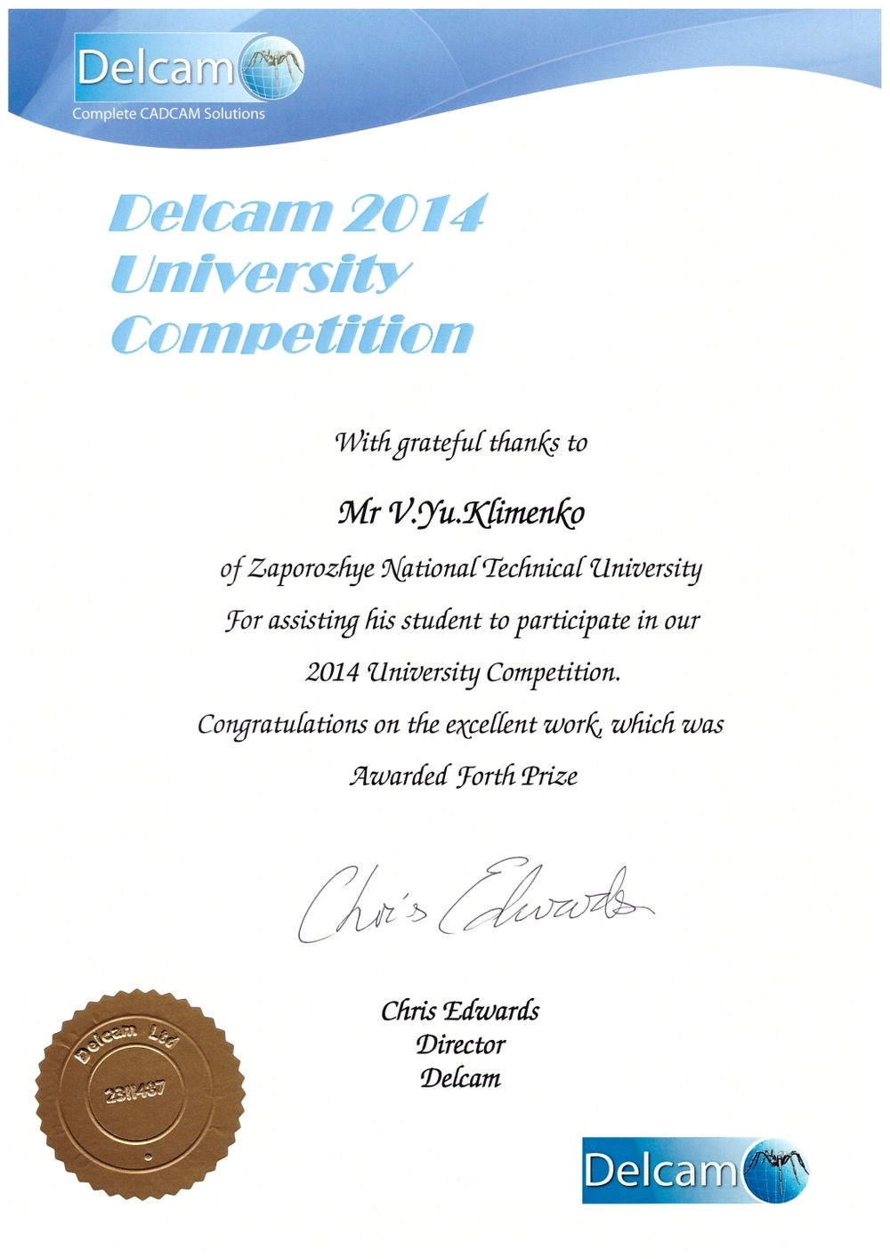 30 березня 2015 року в резиденції посла Великої Британії в Україні пройшла щорічна церемонія нагородження переможців та призерів конкурсу на іменні премії Delcam. Організація заходу проводилася Головним навчальним центром «ЗНТУ-Delcam» спільно з Delcam LTD та резиденцією посла Великої Британії в Україні.