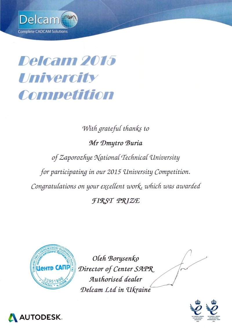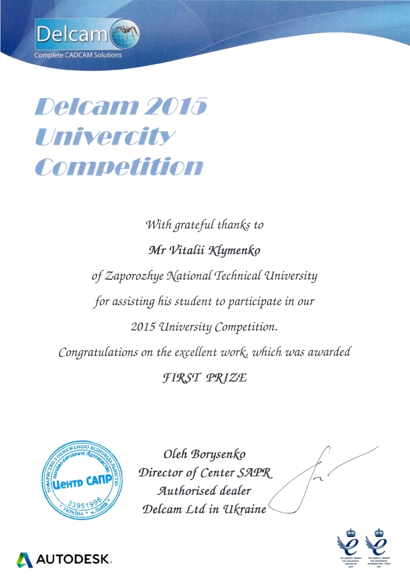17 травня в резиденції Надзвичайного і Повноважного Посла Великої Британії в Україні відбулися урочистості з нагоди нагородження переможців щорічного конкурсу на іменні премії Delcam. В церемонії нагородження прийняла участь заступник голови місії Хелен Фейзі, яка у своїй промові акцентувала важливість проведення таких конкурсів серед студентів вищих навчальних закладів та перспективність співпраці між Великою Британією та Україною у галузі інженерії. Також з вітальним словом виступив Х´ю Хамфрис, ректор ЗНТУ Сергій Бєліков та директор Центру САПР (Авторизований дилер Delcam Ltd в Україні) Олег Борисенко. Керівник головного навчального центру «ЗНТУ-Delcam» Віталій Клименко провів презентацію робіт, які посіли призові місця.