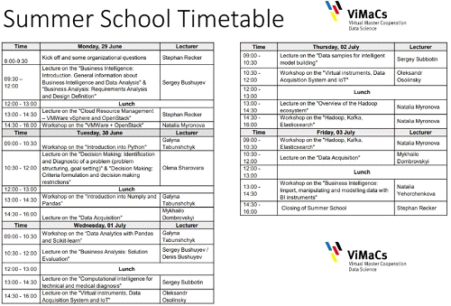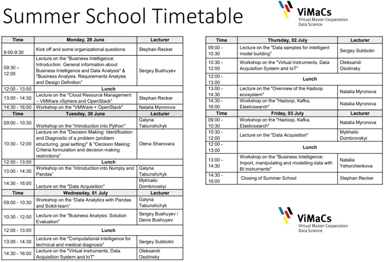 Також Представники кафедри програмних засобів НУ «Запорізька політехніка» взяли участь у Літній школі за проєктом DAAD DAAD «Virtual Master Cooperation Data Science» (ViMaCs). Захід проводився дистанційно на платформі Zoom з 29.06.2020 по 02.07.2020 р. та об'єднав учених, викладачів та здобувачів вищої освіти провідних університетів України з Києва, Тернополя та Запоріжжя, а також Німеччини. В межах школи лекції прочитали: зав. каф. ПЗ, д.т.н., проф. С.О. Субботін, проф. каф. ПЗ, к.т.н., доц. Г.В. Табунщик, доцент каф. ПЗ, к.т.н., Н.О. Миронова. У роботі школи як слухачі взяли участь к.т.н. О.А. Петрова, асистент, аспірант С.Д. Леощенко, асистент, аспірант Д.А. Каврін.