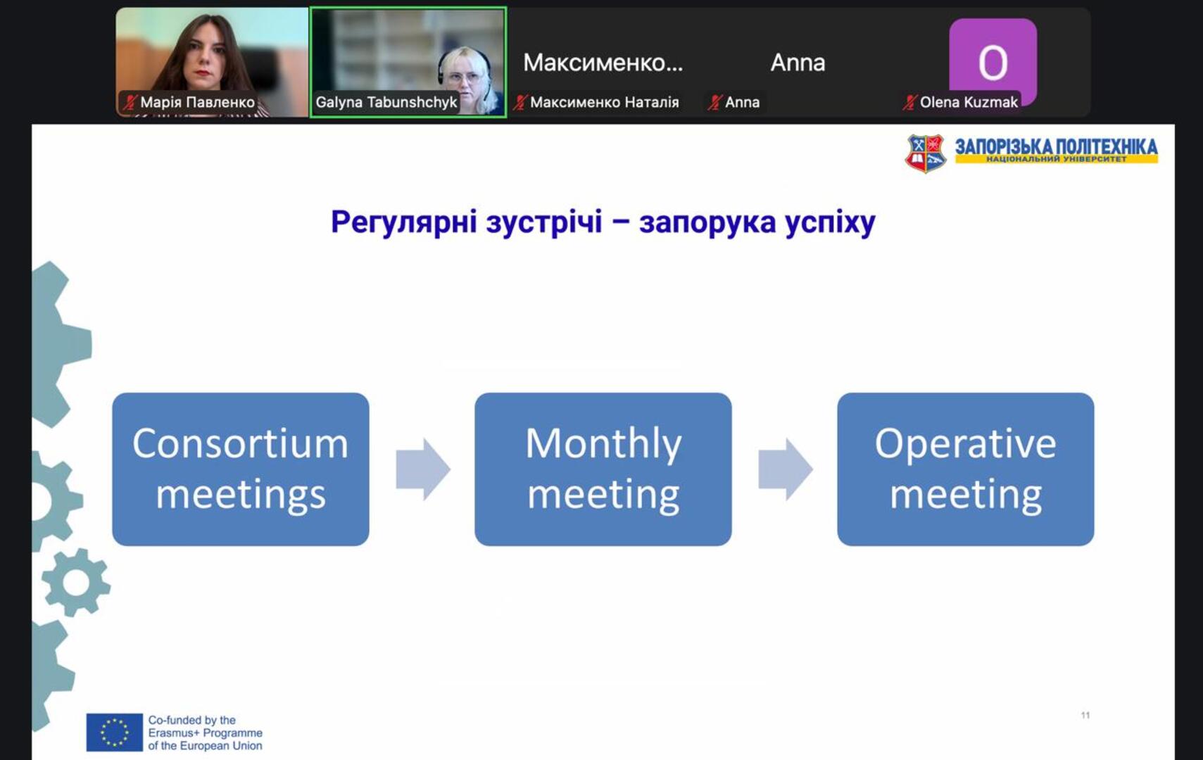 Своїми знаннями поділилися Галина Табунщик, професорка кафедри програмних засобів НУ «Запорізька політехніка». Вона — ініціаторка проєктів Erasmus+ KA1 та KA171, завдяки яким студенти НУ «Запорізька політехніка» мають можливість навчатися та проходити практику в університетах-партнерах всієї Європи. Саме під її координацією університет уперше став грантхолдером Erasmus+ — у межах проєкту WORK4CE (Cross-domain competences for healthy and safe work in the 21st century). Марія Павленко, начальниця відділу проєктної діяльності НУ «Запорізька політехніка», розібрала, як правильно писати заявку Erasmus+ та шукати партнерів.