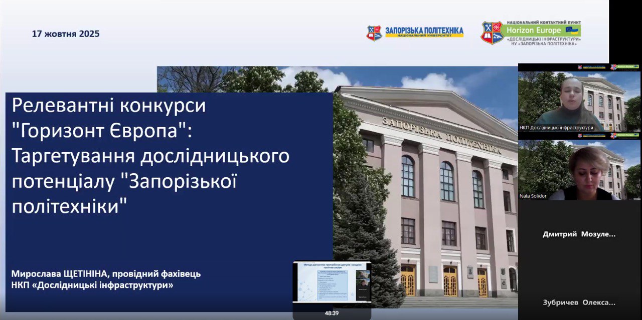 17 жовтня Національний контактний пункт «Дослідницькі інфраструктури», який працює на базі Запорізької політехніки, провів онлайн-захід, присвячений можливостям програми «Горизонт Європа». До зустрічі долучилися представники університетів, наукових установ та бізнесу.