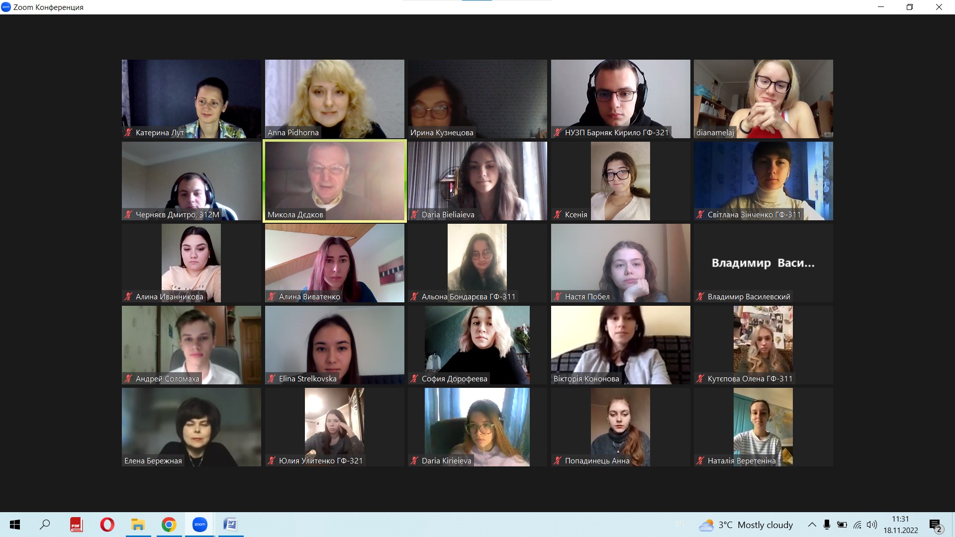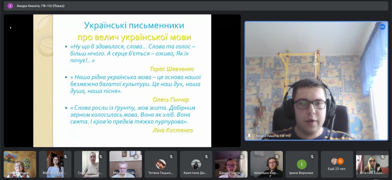 Відкрила захід керівниця відділу наукової роботи студентів Сніжана Вичужаніна, яка привітала учасників міжфакультетського круглого столу й закцентувала на важливості проведення відповідного заходу, наголосила на винятковому значенні рідної мови не лише в національних культурних традиціях, але й в геополітичному вимірі; подякувала ЗСУ за можливість працювати на майбутнє. Засідання круглого столу стало майданчиком для виступів, презентацій студентів багатьох напрямів. До обговорення мовознавчих проблем долучилися бакалаври першого курсу, які прагнуть поглиблено вивчати багатство українського слова. Учасники зосередилася на дослідженні таких питань, як формування термінологічної системи: Сидоренко Тетяна (КНТ – 134) «Вторинна номінація як один із способів творення комп'ютерної термінології»; Савка Діана (БТЕ-1214) «Інтернаціоналізми в економічній термінології: особливості відтворення українською мовою»; порушення норм культури мовлення: Мащенко Аліна (СН-114) «Некоректна лексика в сучасній медіакомунікації: етичні норми та мовна практика»; вплив сучасних подій на особливості функціонування мови: Холодулін Іларіон (БК-814) «Вплив соціальних мереж на українську мову»; відображення національної соціокультурної специфіки: Карпенко Ян (КНТ – 124) «Віддзеркалення національної соціокультурної специфіки у фразеологізмах медіадискурсу»; Кулик Ірина (СН-114) «Вплив вербальних та невербальних засобів комунікації на формування етнічних стереотипів американського й українського етносу»; Лютий Олександр (БК-814) «Етика та етикет у діловому спілкуванні з іноземцями»; репрезентації мовної особистості в інтернет-просторі: Свергун Євгеній (КНТ – 134) «Нікнейм геймера як специфічна форма самопрезентації особистості в інтернет-комунікації»; Дев’ятка Єгор (КНТ – 114) «Емотивна лексика на позначення емоцій задоволення й смутку (на матеріалі постів в Інстаграм)»; становлення культурної та гендерної ідентичності особистості: Чакмазова Катерина (КНТ – 124) «Гендерні особливості в мовній комунікації (на матеріалі комп’ютерного дискурсу)»; Вовк Єгор (ЕТФ – 714) «Значення гендерних маркерів при перекладі офіційно-ділових промов».