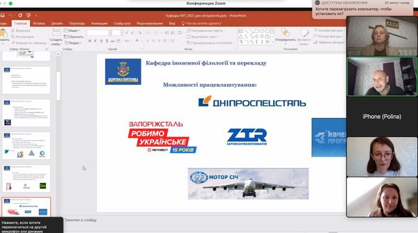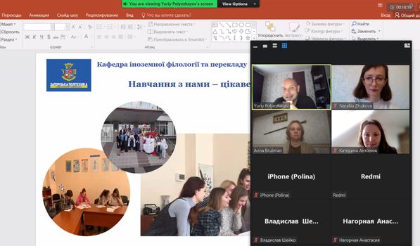 7 листопада 2023 р. відбулась зустріч з учнями 11 в Запорізької гімназії №6 Запорізької міської ради Запорізької області, організована доц. Спудкою І.М.(кафедра українознавства та загальної мовної підготовки) з представниками випускових кафедр Гуманітарного факультету НУ «Запорізька політехніка». Кафедру «Іноземна філологія та переклад» представляла доц. Хавкіна О.М., яка ознайомив учнів з освітніми програмами: «Германські мови та літератури (переклад включно), перша – англійська)» та «Германські мови та літератури (юридичний переклад включно)», кафедру «Міжнародні економічні відносини» представляла доц. Козицька Г.В., яка ознайомила учнів з освітніми програмами «Міжнародний бізнес» та «Міжнародна економіка та економічна безпека». Дякуємо за організаційну підтримку керівному складу Запорізької гімназії №6 Запорізької міської ради Запорізької області, зокрема: Плотніковій Н.В. та класним керівникам: 11а класу Свиридовій Н.В., 11 б класу Гоголенко О.А., 11 в класу Дрюк Т.О., 10 а класу Купрієнко І.В. за надану можливість у проведенні профорієнтаційної роботи!