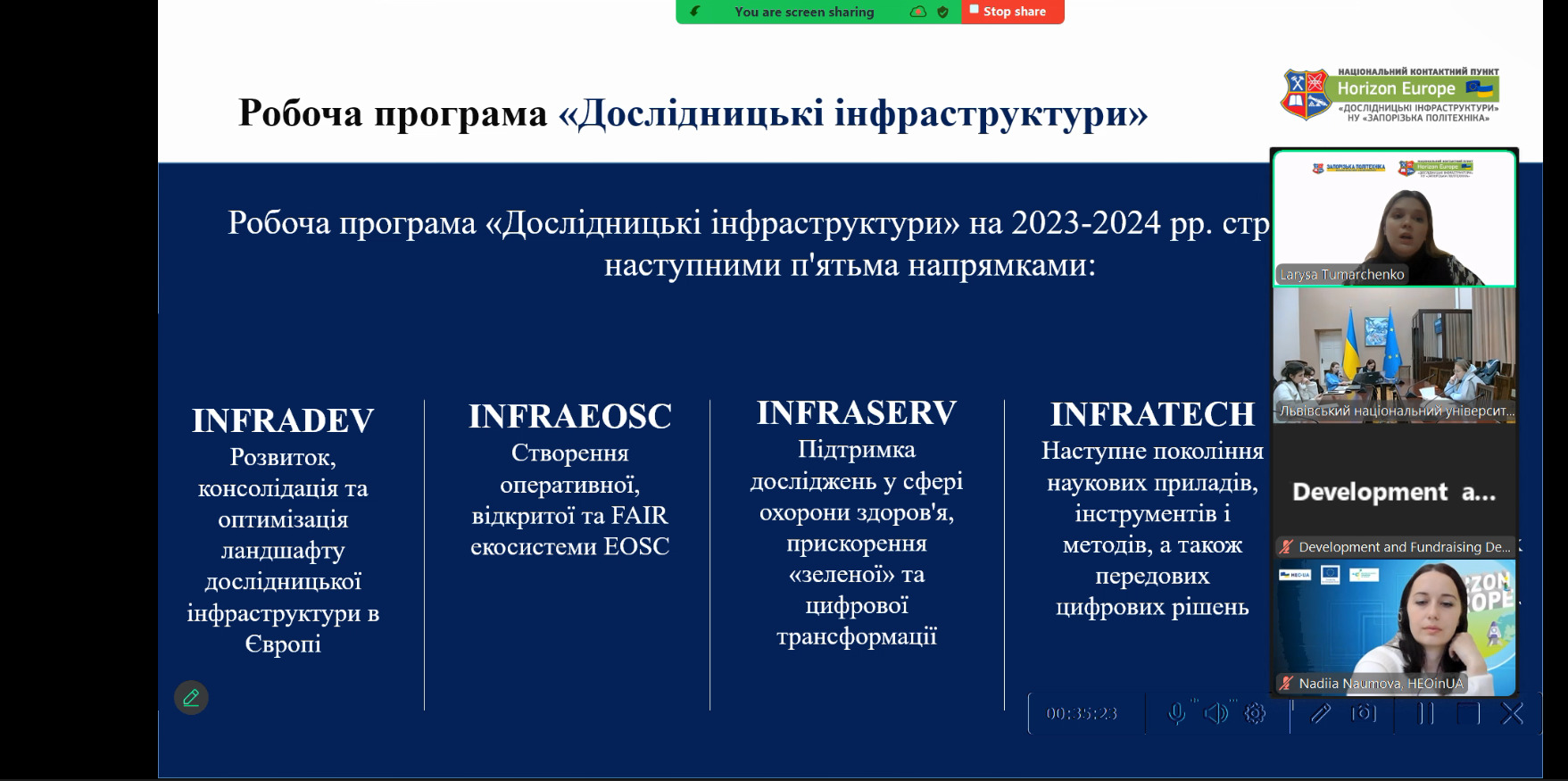 13 грудня інформаційний день, присвячений програмним компонентам «WIDERA» та «Дослідницьким інфраструктурам», провели у Львівському національному університеті імені Івана Франка. Лариса Тумарченко, провідна фахівчиня НКП «Дослідницькі інфраструктури», висвітлила можливості доступу до європейських дослідницьких інфраструктур, які відкривають нові горизонти для українських організацій.