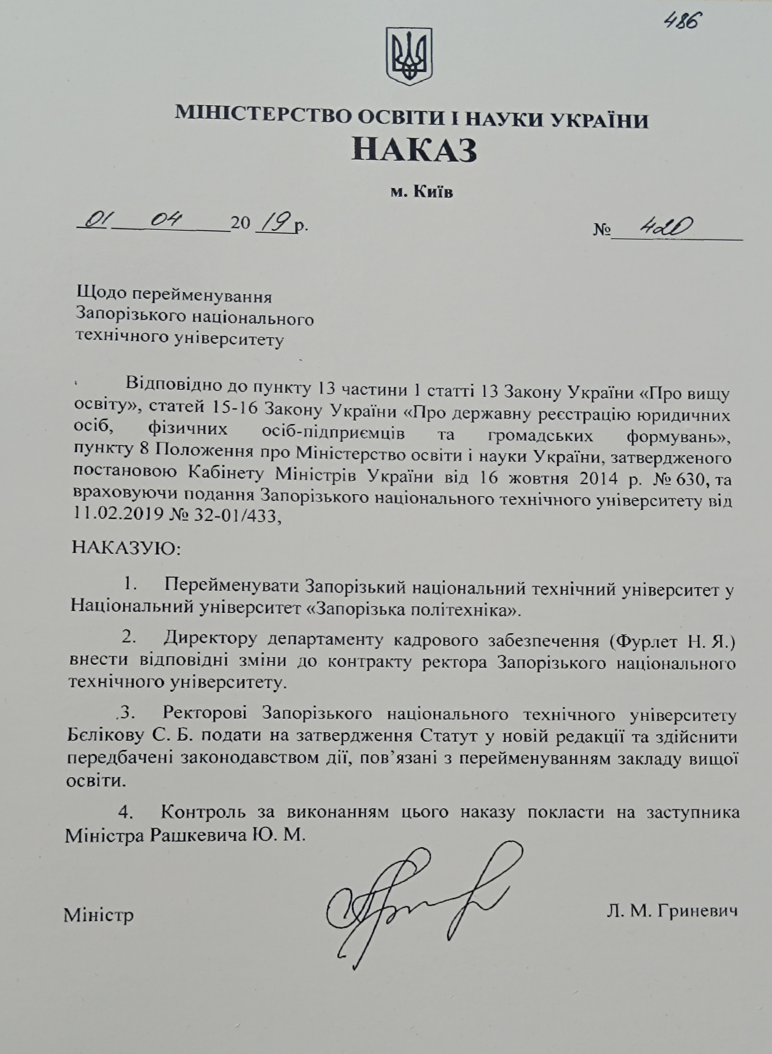 Згідно з Наказом Міністерства освіти і науки України № 420 від 1 квітня 2019 р., Запорізький національний технічний університет перейменовано на Національний університет «Запорізька політехніка». 25 червня 2019 р. затверджено нову редакцію Статуту НУ «Запорізька політехніка».