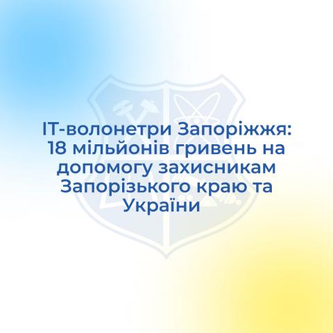 Разом із небайдужими громадянами, представниками IT-сфери та іншими бізнесами міста Запоріжжя, залучивши й представників бізнес-спільнот інших держав та регіонів України, «ІТ-волонтери Запоріжжя» зібрали понад 18 мільйонів гривень, зароблених 855 донорами, які спрямували на допомогу українським військовим та цивільним, що постраждали від російської агресії.