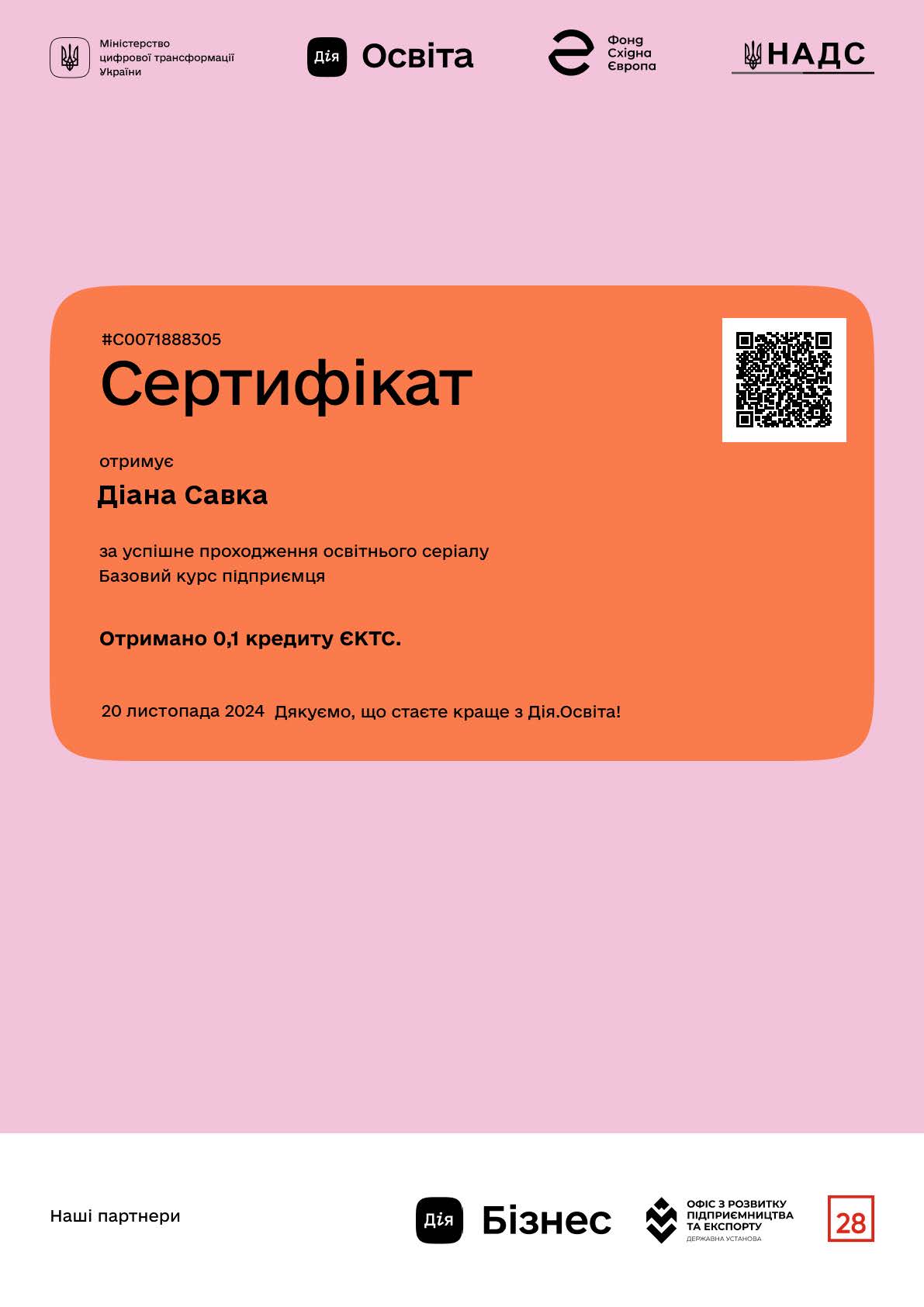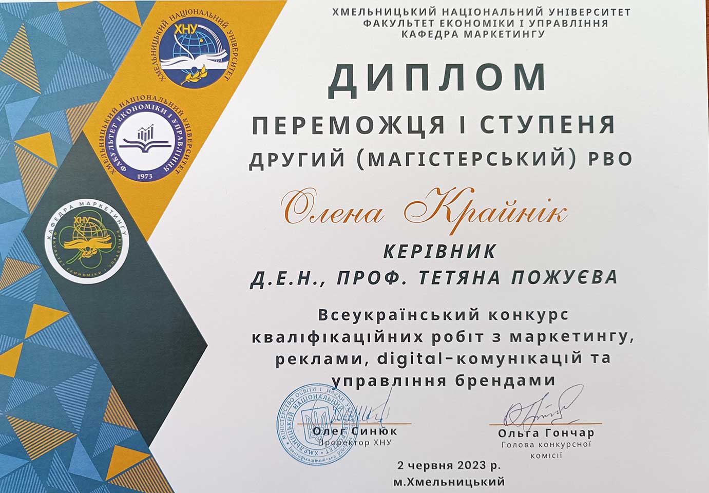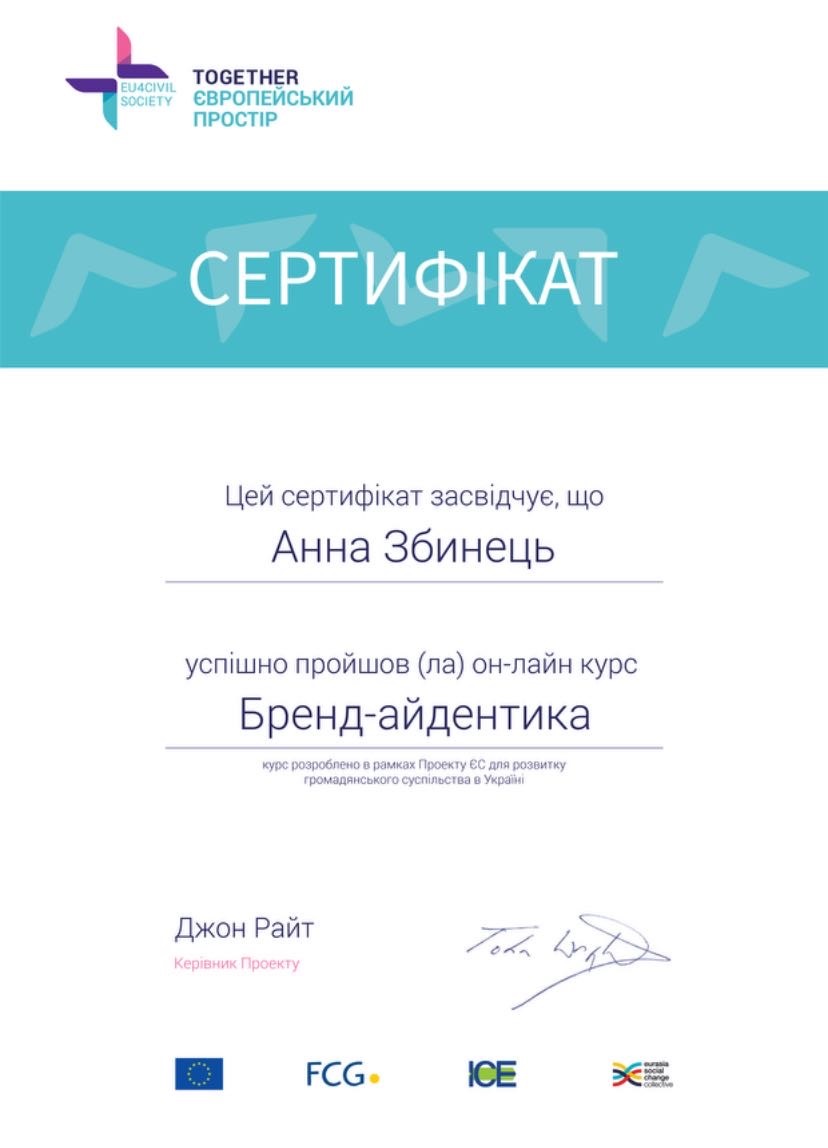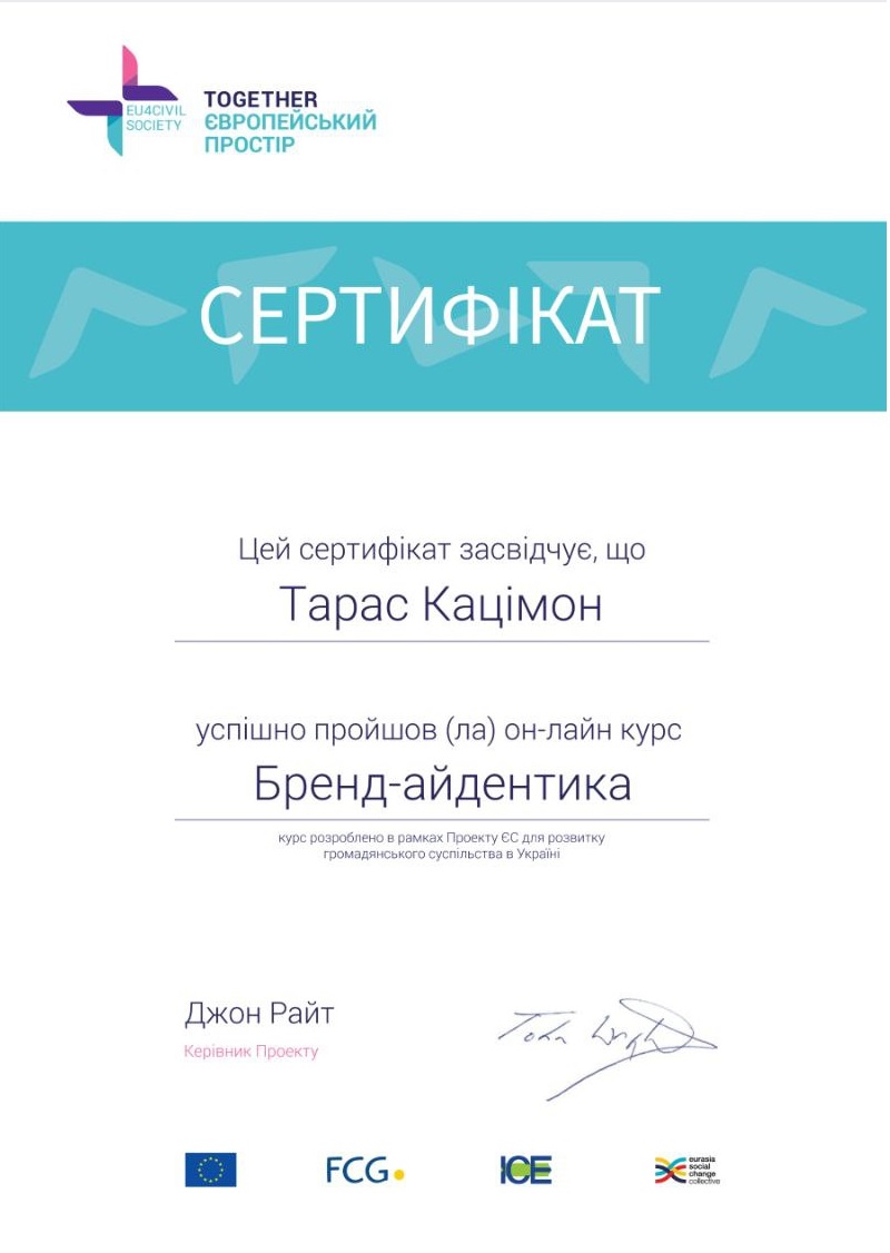 У рамках вивчення дисципліни «Особистий бренд», викладання якої здійснює доцент кафедри Чернова І.В., студентам першого курсу спеціальності 073 "Менеджмент" було запропоновано пройти онлайн-курс «Бренд-айдентика». Курс розроблено в рамках Проєкту ЄС для розвитку громадянського суспільства в Україні. Найактивніші студенти, які успішно опанували навчальний матеріал, отримали відповідні сертифікати міжнародного зразка.