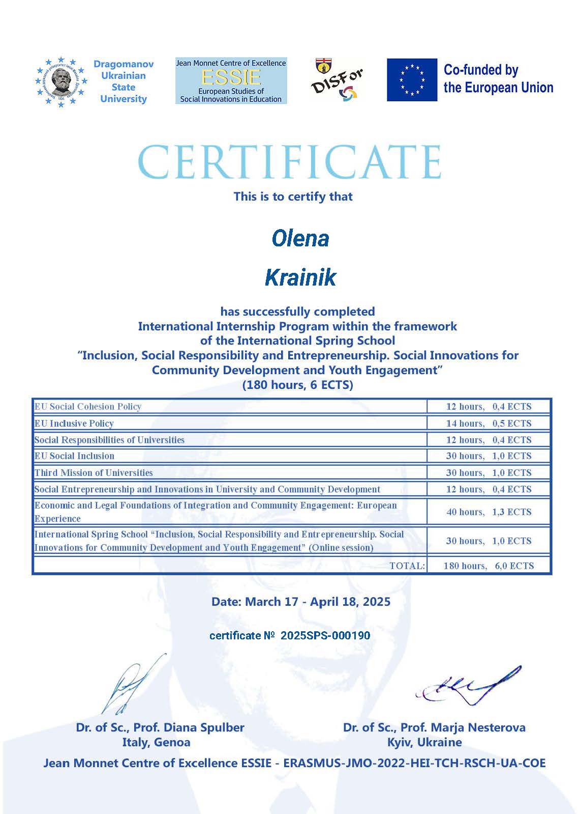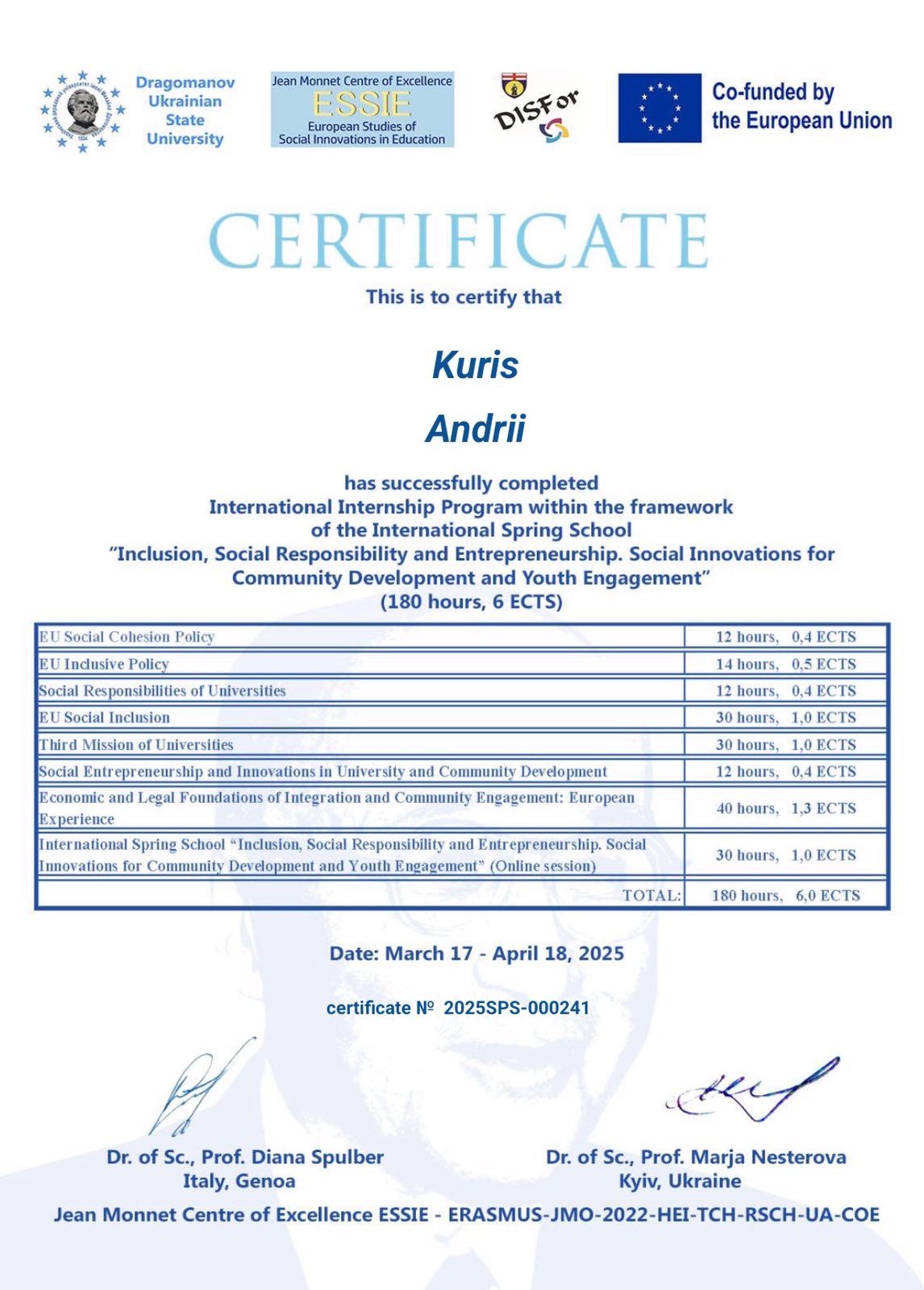 У період з 17 березня по 18 квітня 2025 року викладачі кафедри Бізнесу та управління Крайнік О., Сергієнко Т. та студент 1 курсу спеціальності 073 «Менеджмент» Куріс А. взяли участь у Міжнародній весняній школі «Інклюзія, соціальна відповідальність та підприємництво. Соціальні інновації для розвитку громад та залучення молоді».