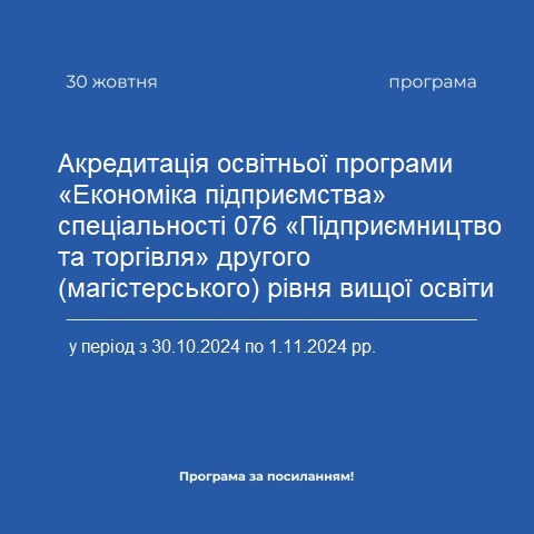 Ознайомитись з програмою проведення акредитаційної експертизи з використанням технічних засобів відеозв'язку у Національному університеті «Запорізька політехніка» освітньої програми «Економіка підприємства» (ID у ЄДЕБО 60324) спеціальності 076 «Підприємництво та торгівля» другого (магістерського) рівня вищої освіти у період з 30.10.2024 р. по 01.11.2024 р. можна за посиланням: