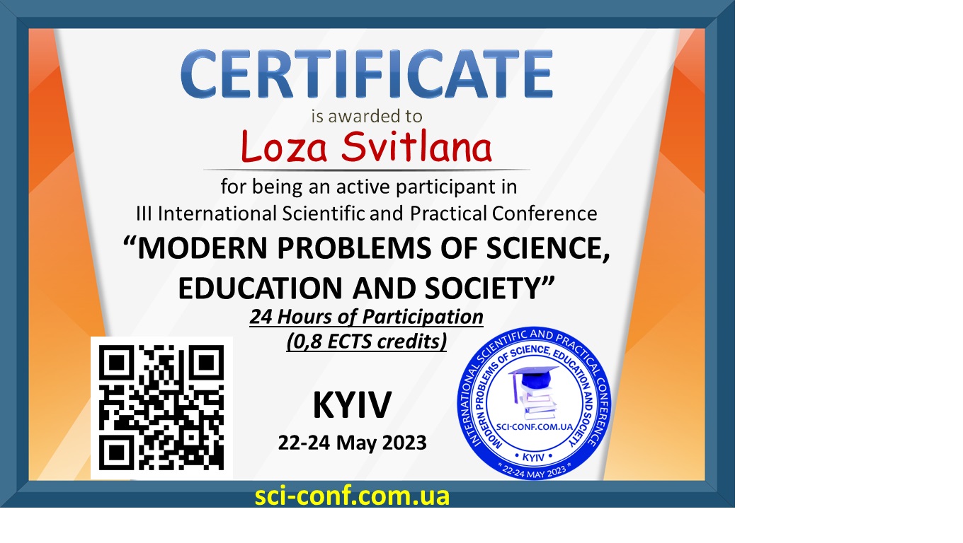 Сертифікат участі у науково-практиній конференції "Сучасні проблеми науки, освіти і суспільства" (2023 р.)