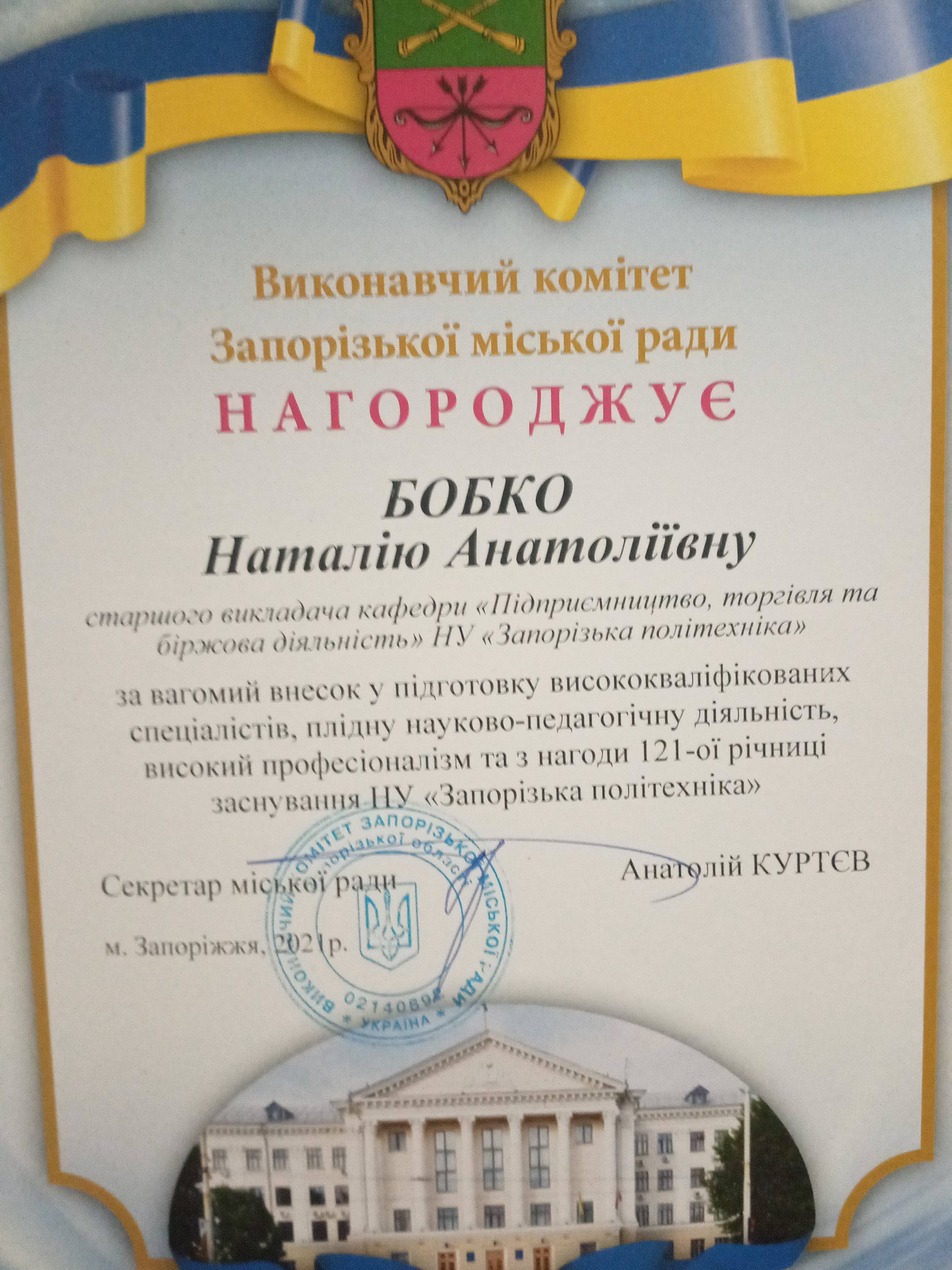 Bobko N.A. Іnnovative development as a factor of the company’s strategic success // Матеріали Міжнародної науково-практичної конференції «Стратегічні пріоритети розвитку підприємництва, торгівлі та біржової діяльності» 14-15 травня 2020 р. / За заг. редакцією проф. Ткаченко А. М. [Електронний ресурс] Електрон. дані. – Запоріжжя : НУ «Запорізька політехніка», 2020. – 1 електрон. опт. диск (DVD-ROM); 12 см. – Назва з тит. екрана. – 408 с. – С. 147-148.