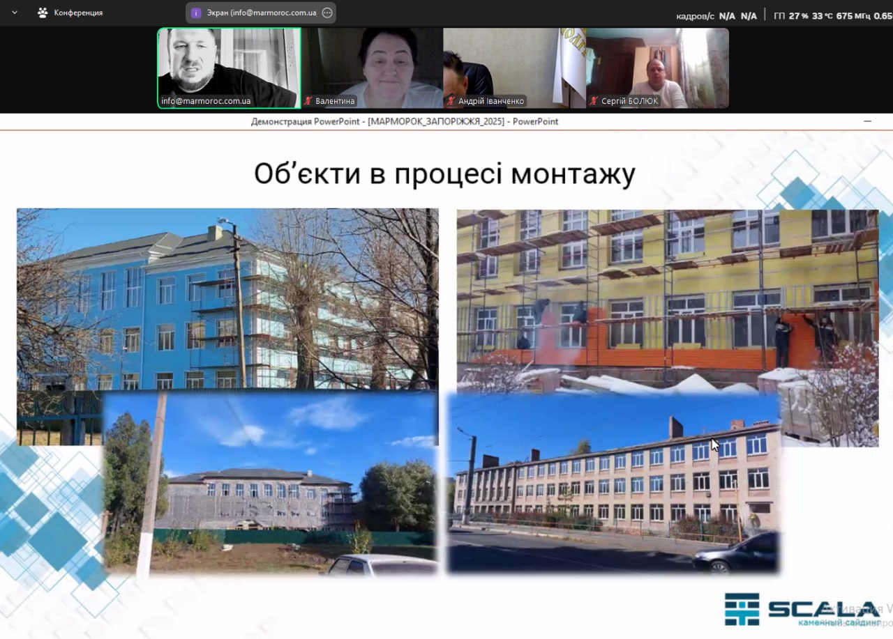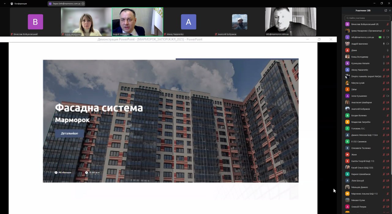 Протягом зустрічі підіймались актуальні питання варіантів теплоізоляції огороджувальних конструкцій вентильованими фасадами, зокрема системою «Ventarock». Були розглянуті приклади термомодернізації будівель у Запорізькому регіоні та загалом у нашій країні, технологічні та конструктивні елементи систем вентильованих фасадів, процеси, пов’язані з організацією монтажу систем та особливості розрахунку техніко-економічних показників для реалізації монтажу таких систем.